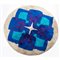 Tappetto circolare in lana a disegno geometrico nei toni beige, blu e turchese.