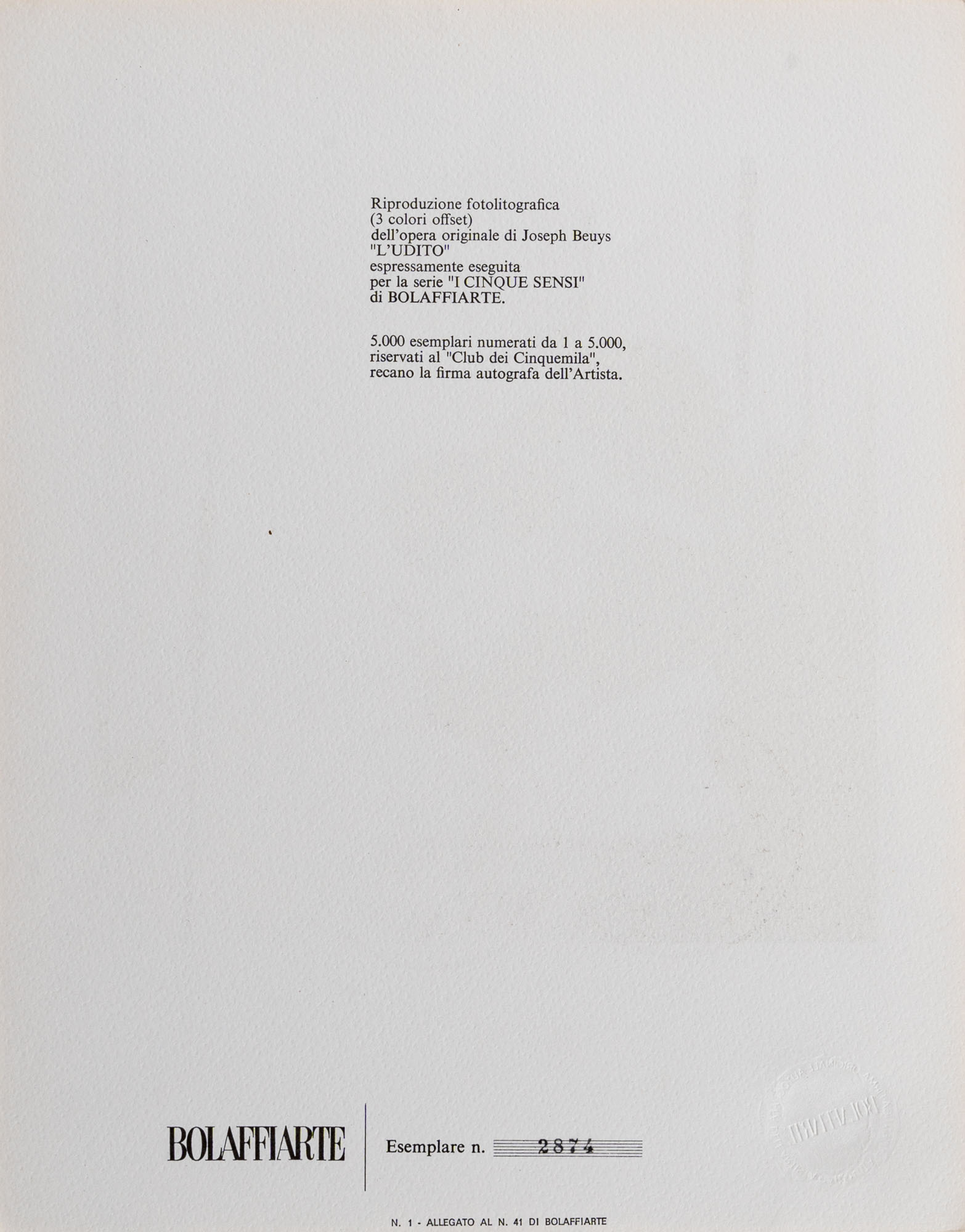 JOSEPH BEUYS(1921 - 1986)L'udito1974Litografia con catalogo, es. 2874/500030 x 23,5 cmFirmata in basso al centroNumerazione al retro