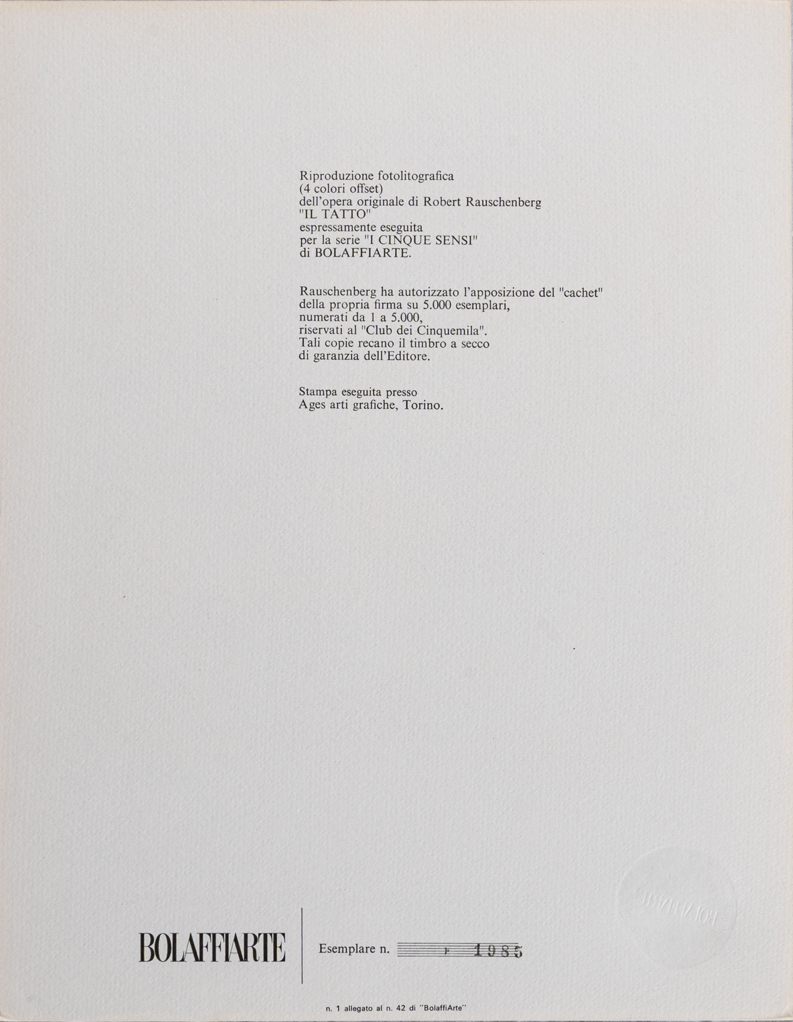 ROBERT RAUSCHENBERG(1925 - 2008)Il tatto1974Litografia con catalogo, es. 1985/500030 x 23,5 cmNumerazione al retro