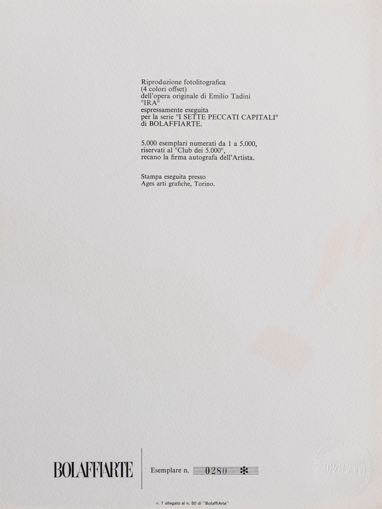 EMILIO TADINI(1927 - 2002)Ira1978Litografia con catalogo, es. 280/500028 x 21 cmFirmata in basso al centroNumerazione al retro