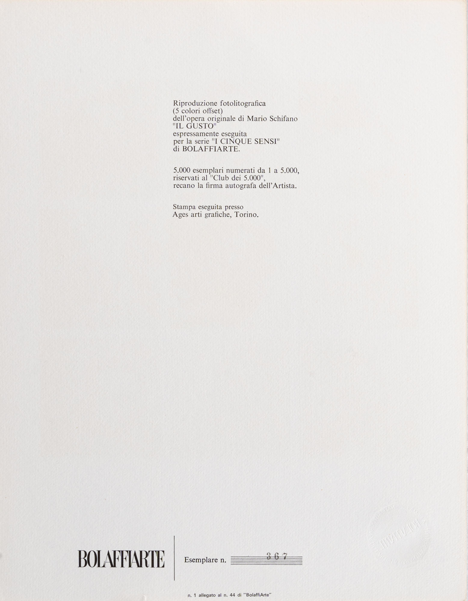 MARIO SCHIFANO(1934 - 1998)Il gusto1974Litografia con catalogo, es. 367/500030 x 23,5 cmFirmata in basso a destraNumerazione al retro