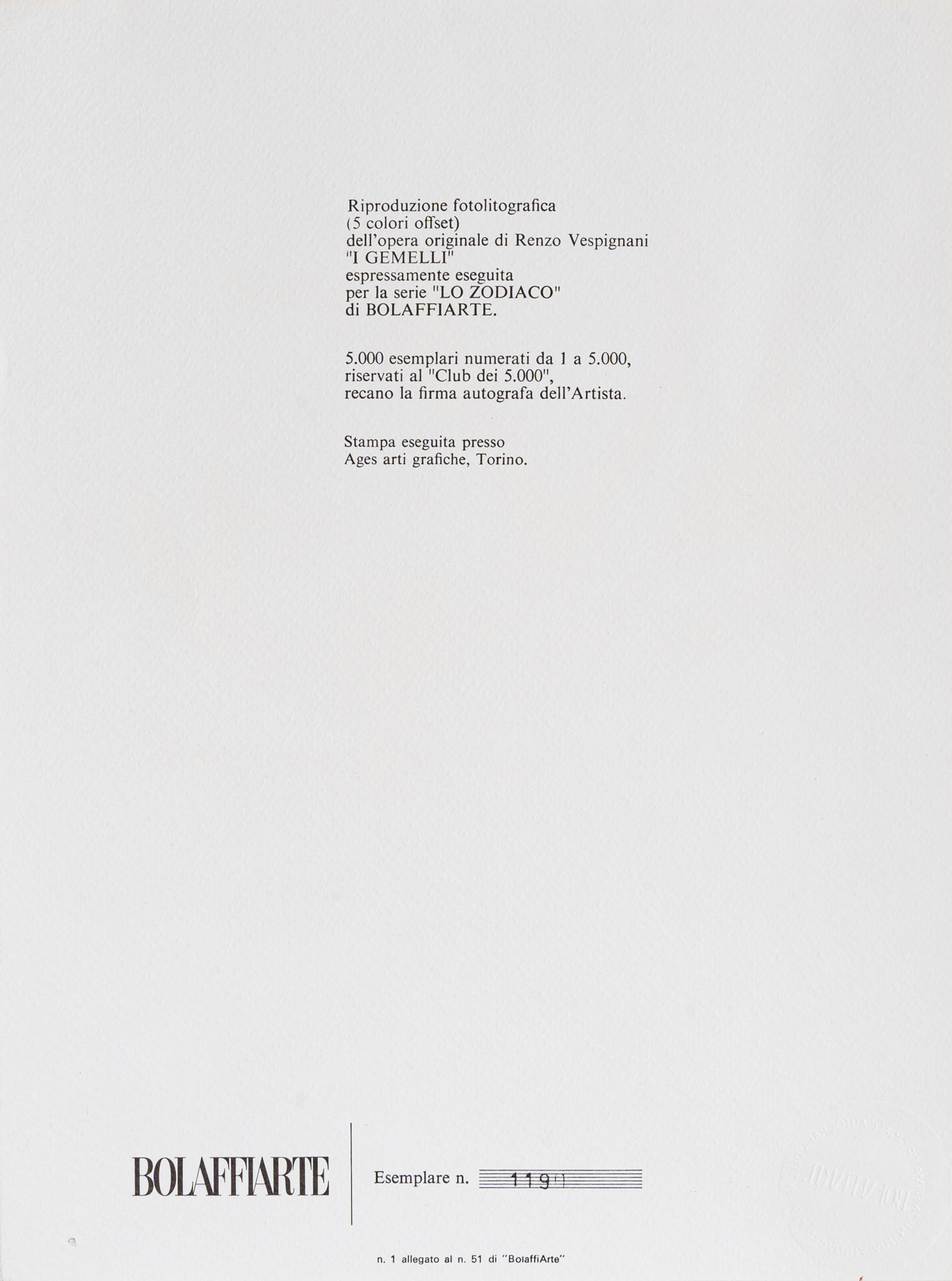 RENZO VESPIGNANI(1924 - 2001)I gemelli1975Litografia con catalogo, es. 1190/500028 x 21 cmFirmata e datata in basso a destraNumerazione al retro