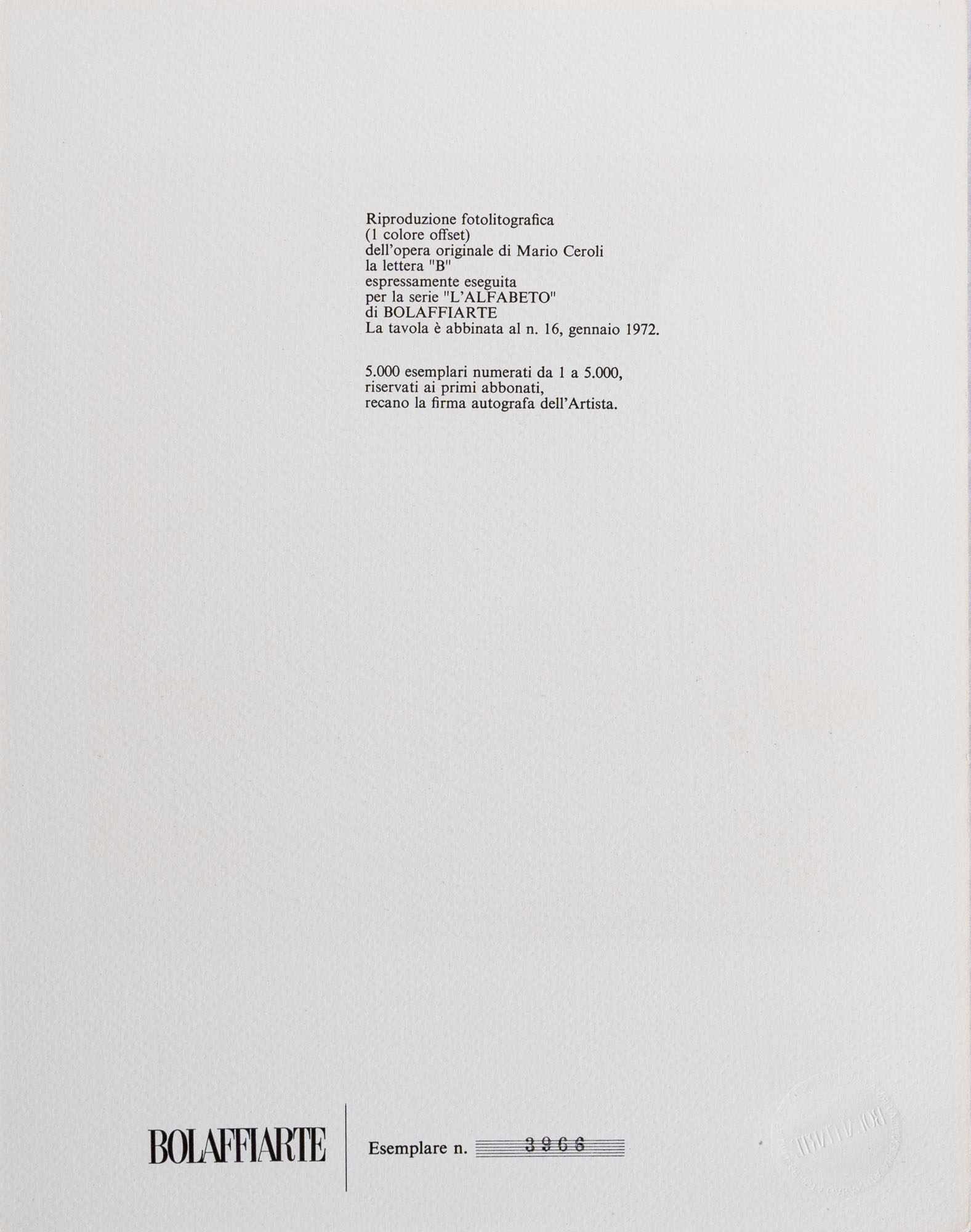 MARIO CEROLI(1938)Lettera B1972Litografia con catalogo, es. 3966/500030 x 23,5 cmFirmato in basso a destraNumerazione al retro