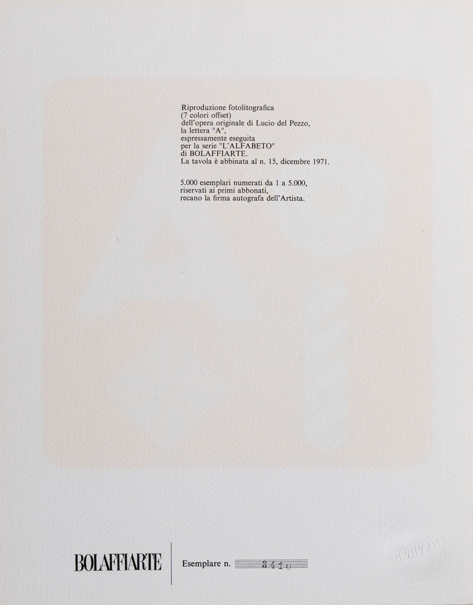 LUCIO DEL PEZZO(1933 - 2020)Lettera A1971Litografia con catalogo, es. 3410/500030 x 23,5 cmFirmata in basso a destra Numerazione al retro
