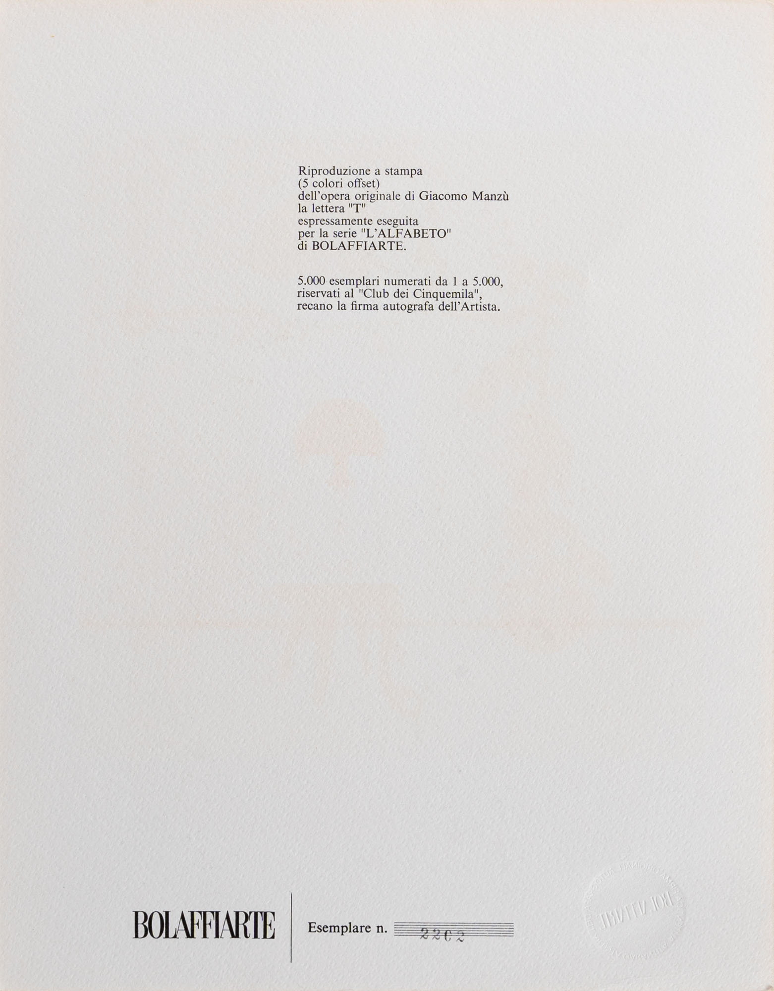 GIACOMO MANZÙ(1908 - 1991)Lettera T1973Litografia con catalogo, es. 2202/500030 x 23,5 cmFirmata in basso a destraNumerazione al retro
