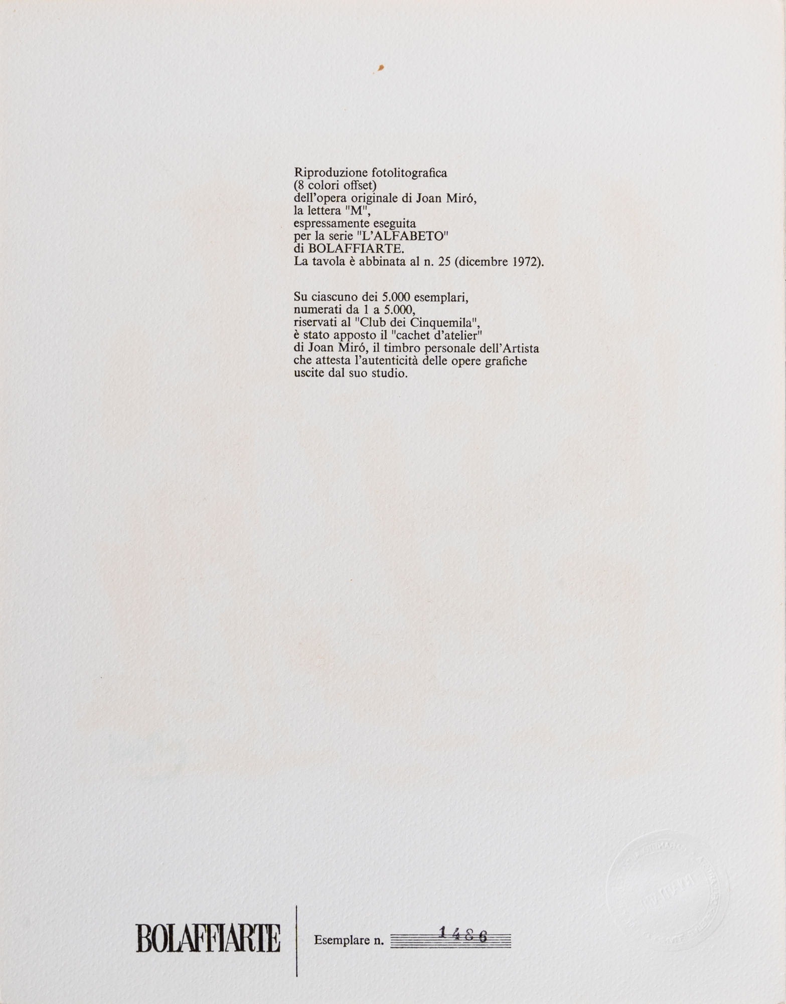 JOAN MIRÒ(1893 - 1983)Lettera M1972Litografia con catalogo, es. 1486/500030 x 23,5 cmNumerazione al retro
