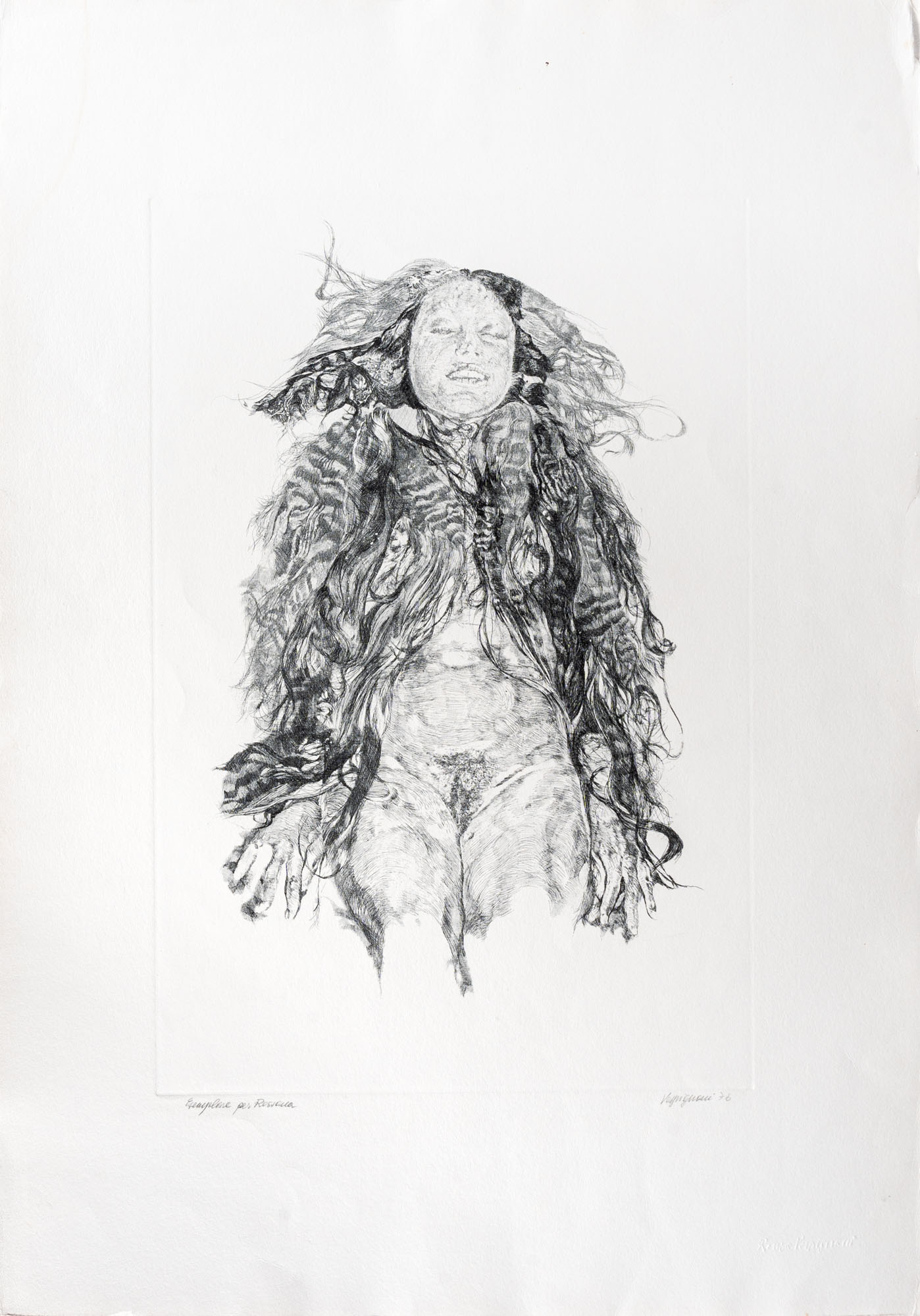 RENZO VESPIGNANI(1924 - 2001)Senza titolo1976Incisione a cera molle, es. non numerato47,5 x 32 cm (lastra)70,5 x 50 cm (foglio)Firmata e datata a matita in basso a destra, dedicata a matita in basso a sinistraPROVENIENZA:Collezione privata, Roma