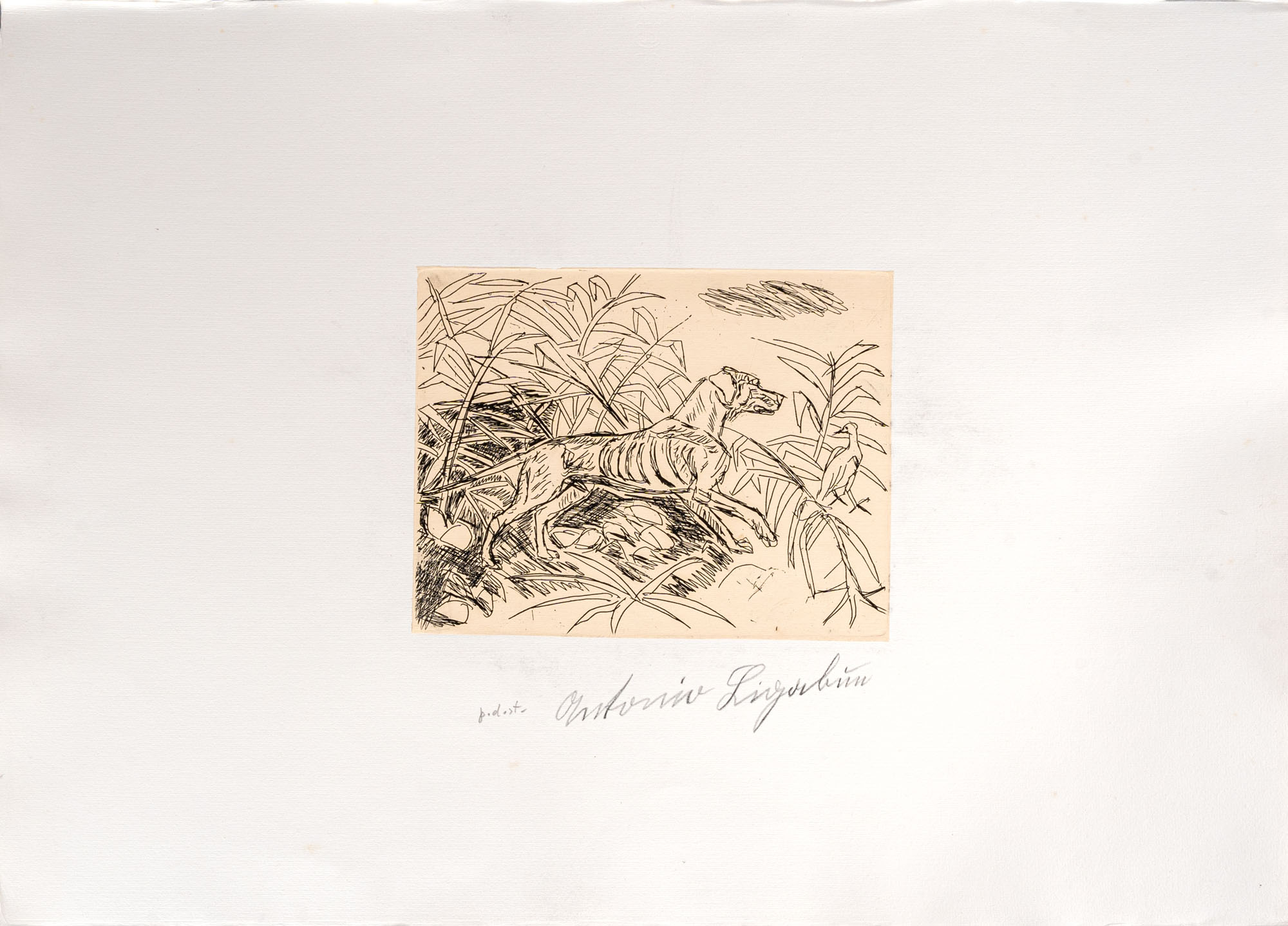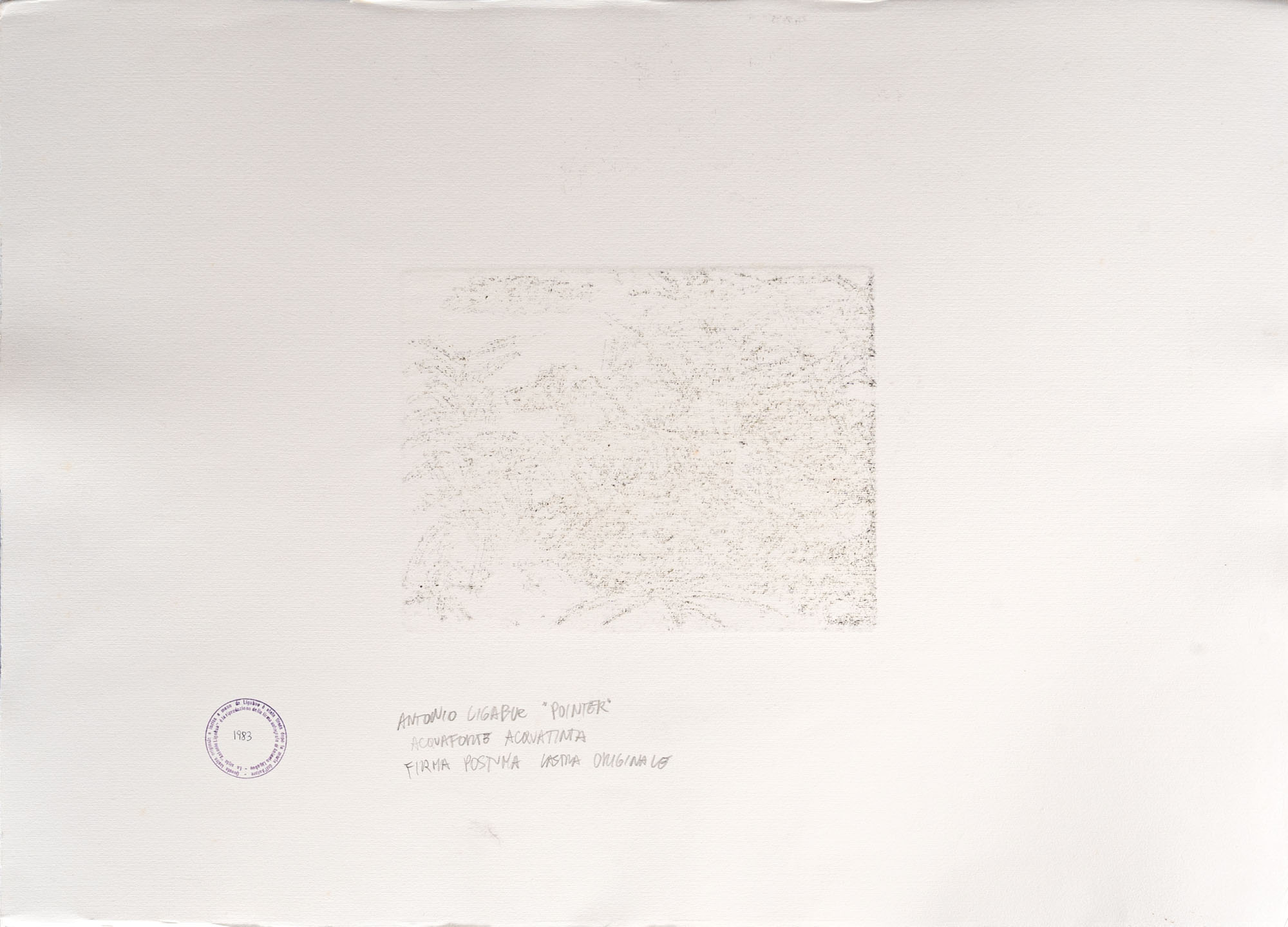 ANTONIO LIGABUE(1899 - 1965)PointerAcquaforte e acquatinta, es. p.d.a.20 x 26 cm (lastra)50 x 69,5 cm (foglio)Firmata in lastra e numerata in basso al centroPROVENIENZA:Collezione privata, Roma