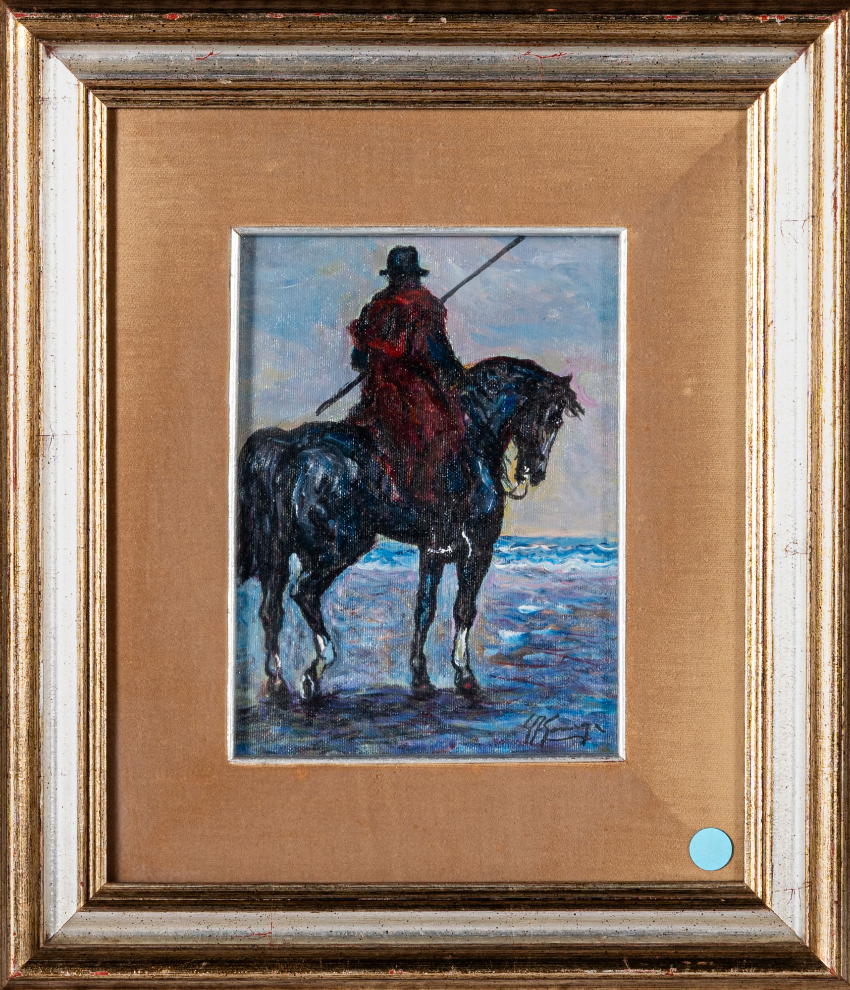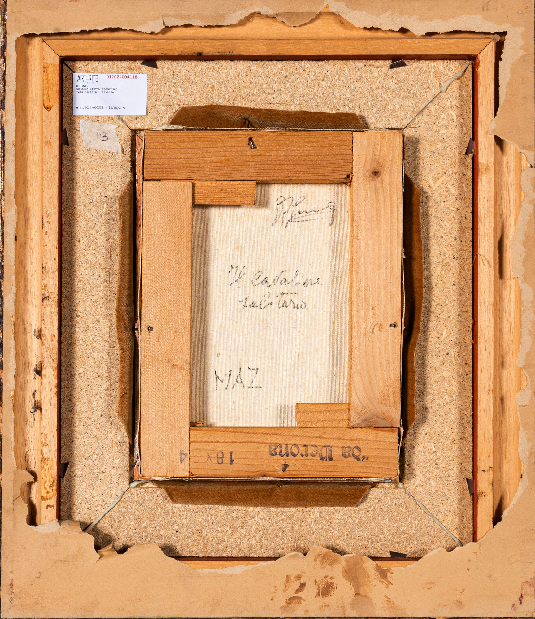 GIOVAN FRANCESCO GONZAGA(1921 - 2007)Il cavaliere solitarioOlio su tela24,5 x 18 cmFirmata in basso a destraFirma e titolo al retroPROVENIENZA:Collezione privata, Biella