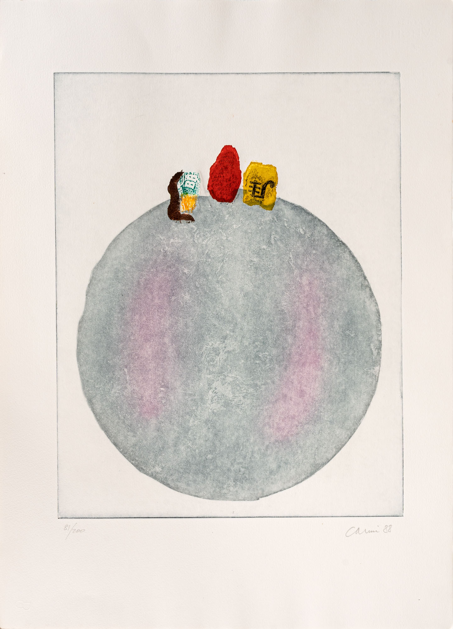 EUGENIO CARMI(1920 - 2016)Senza titolo (I tre cosmonauti)1988Acquaforte e acquatinta, es. 81/20044 x 34,5 cm (lastra)62,8 x 45,5 cm (foglio)Firmata e datata a matita in basso a destra, numerata in basso a sinistraIllustrazione per la copertina del volume ' I tre cosmonauti', con testi di Umberto EcoPROVENIENZA:Collezione privata, Monza