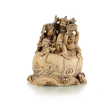 NETSUKE IN AVORIO, GIAPPONE, XIX SECOLO, raffigurante i sette saggi sulla barca della felicità, firma incisa; lievi sbeccature.