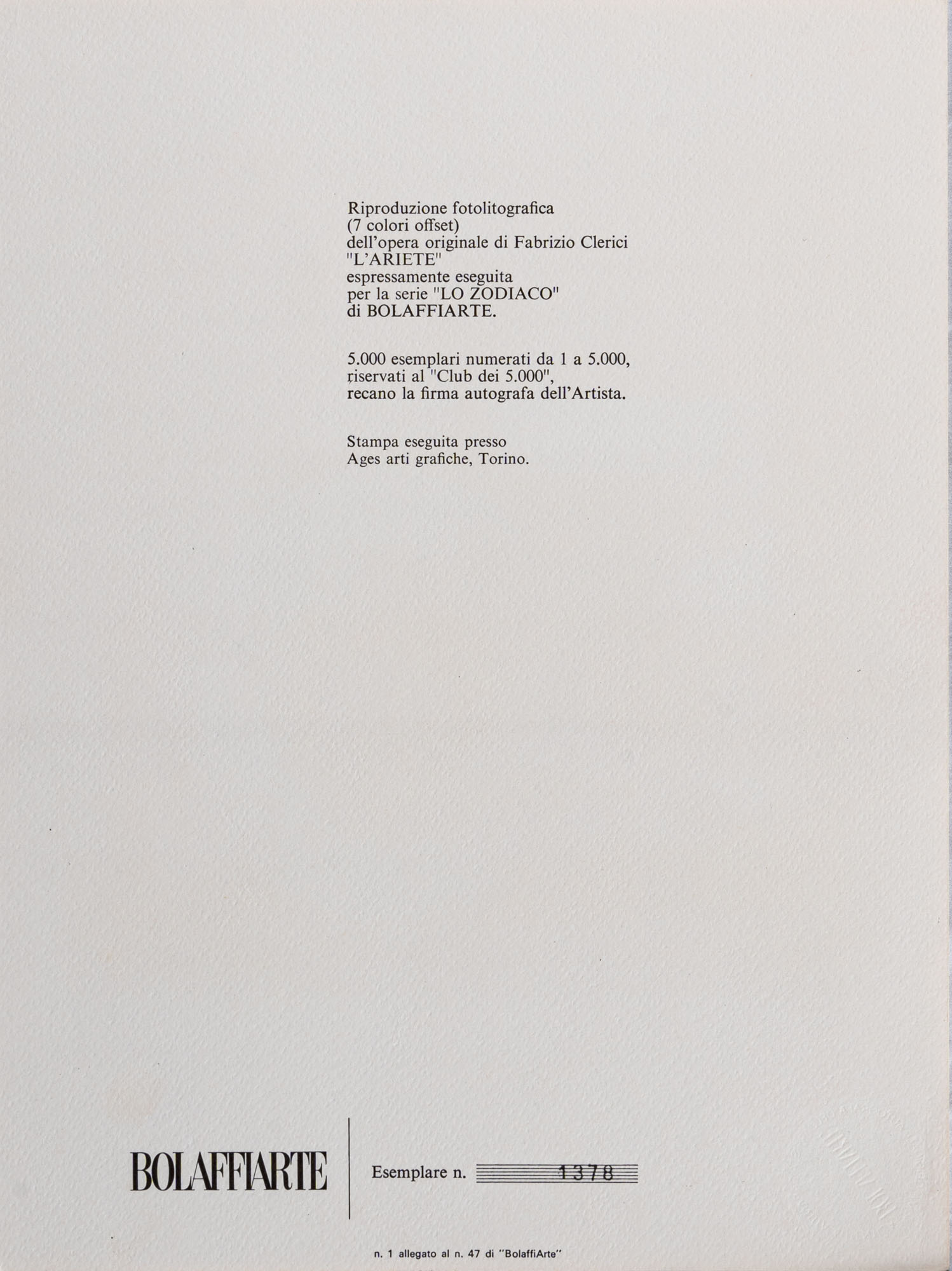FABRIZIO CLERICI(1913 - 1993)L'ariete1975Litografia con catalogo, es. 1378/500028 x 21 cmFirmata in basso a destraNumerazione al retro