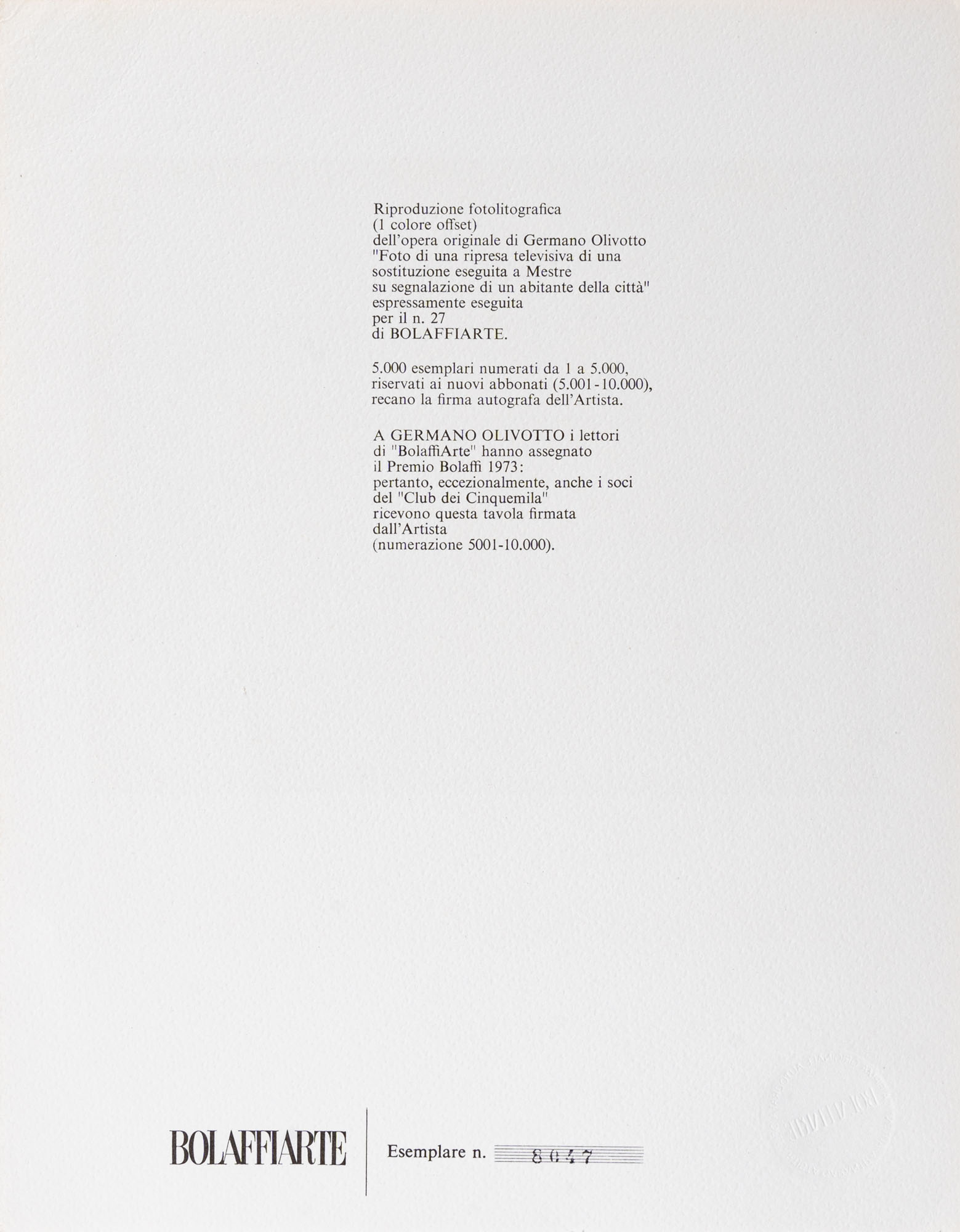 GERMANO OLIVOTTOFoto di una ripresa televisiva di una sostituzione eseguita a Mestre su segnalazione di un abitante della città1973Litografia, es. 8047/1000030 x 23,5 cmFirmata in basso a destraNumerazione al retro