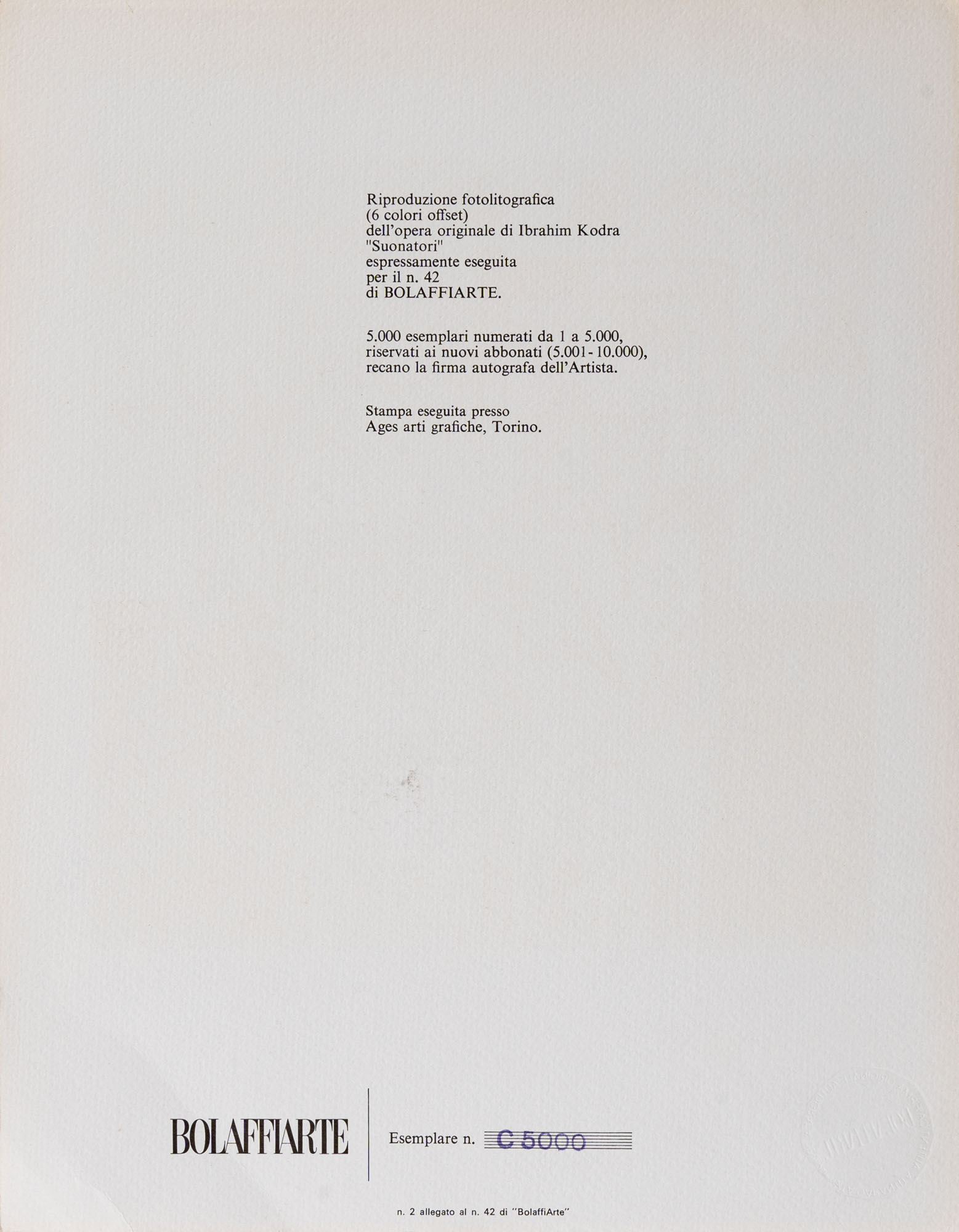 IBRAHIM KODRA(1908 - 2006)Suonatori1974Litografia, es. 5000/500030 x 23,5 cmFirmata in basso a destraNumerazione al retro