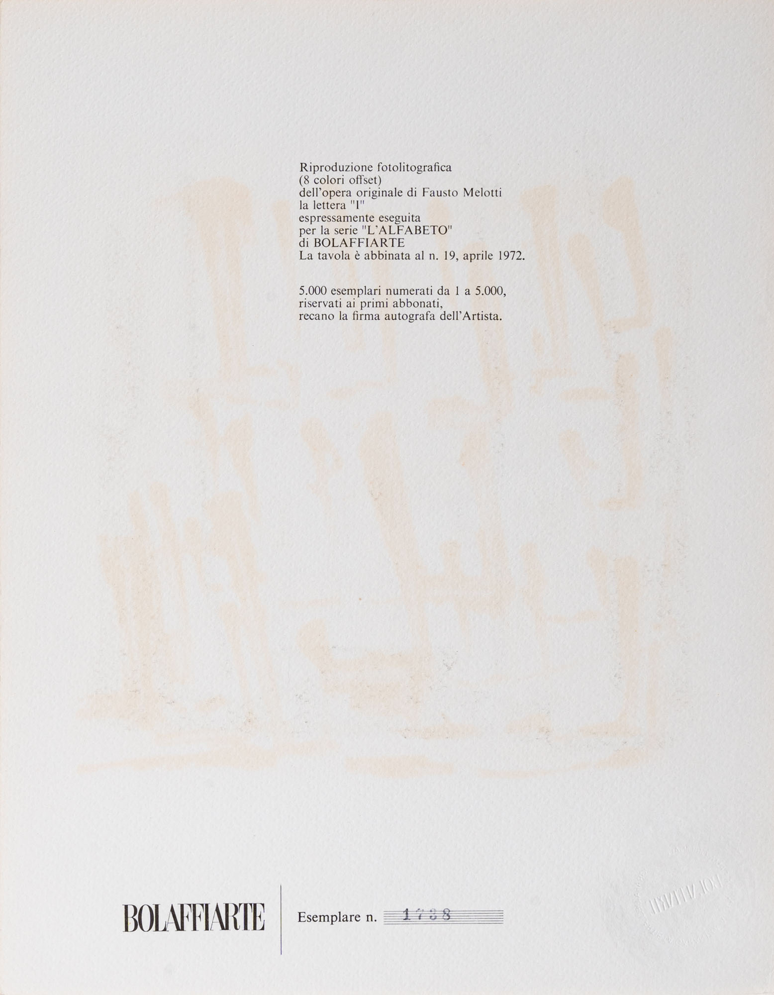 FAUSTO MELOTTI(1901 - 1986)Lettera I1972Litografia con catalogo, es. 1738/500030 x 23,5 cmFirmata in basso a destraNumerazione al retro