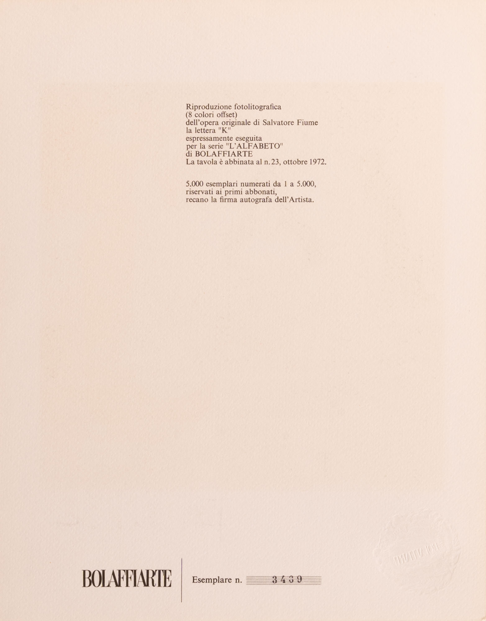SALVATORE FIUME(1915 - 1997)Lettera K1972Litografia con catalogo, es. 3469/500030 x 23,5 cmFirmata in basso a destraNumerazione al retro