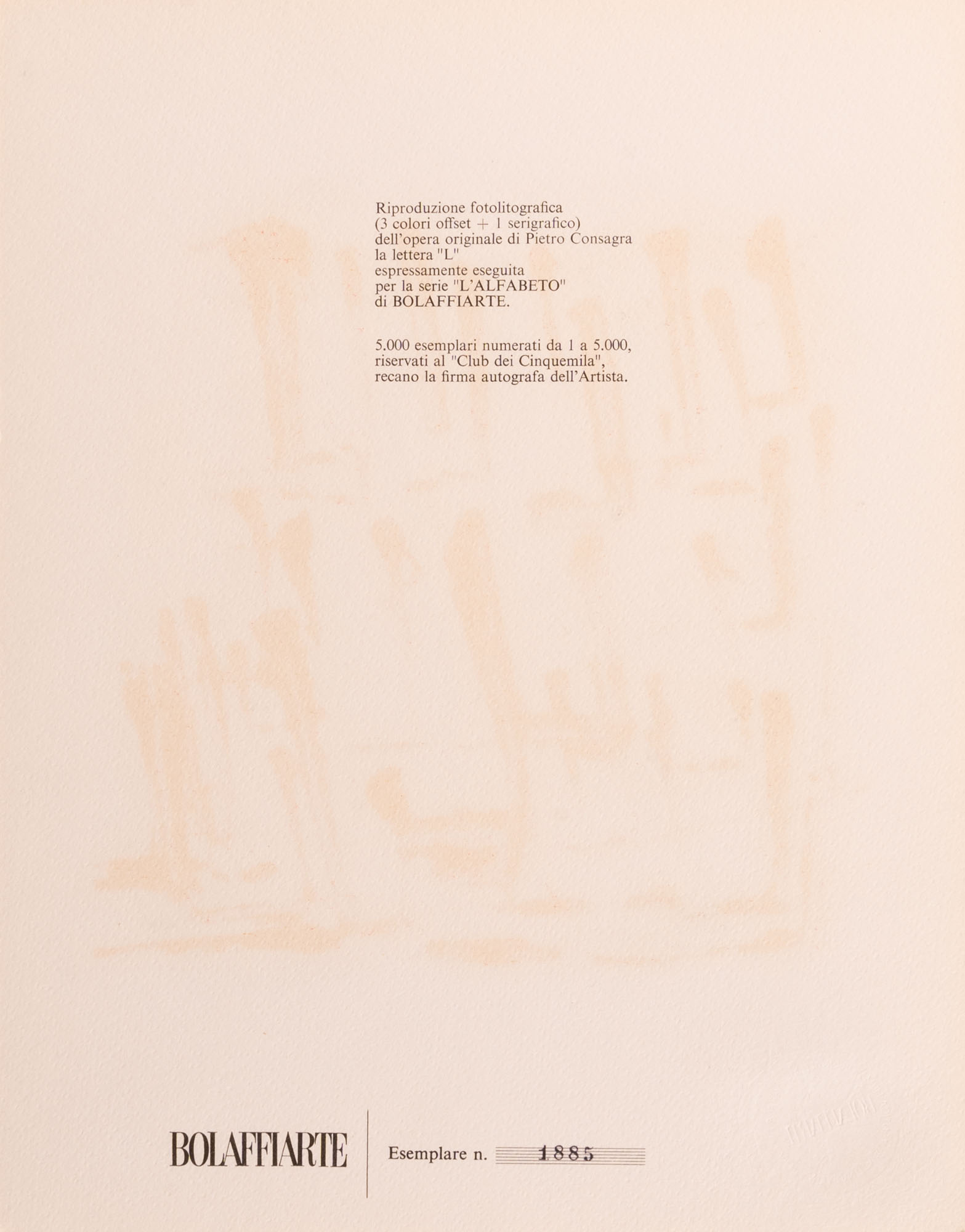PIETRO CONSAGRA(1920 - 2005)Lettera L1973Litografia con catalogo, es. 1885/500030 x 23,5 cmFirmata in basso a destraNumerazione al retro