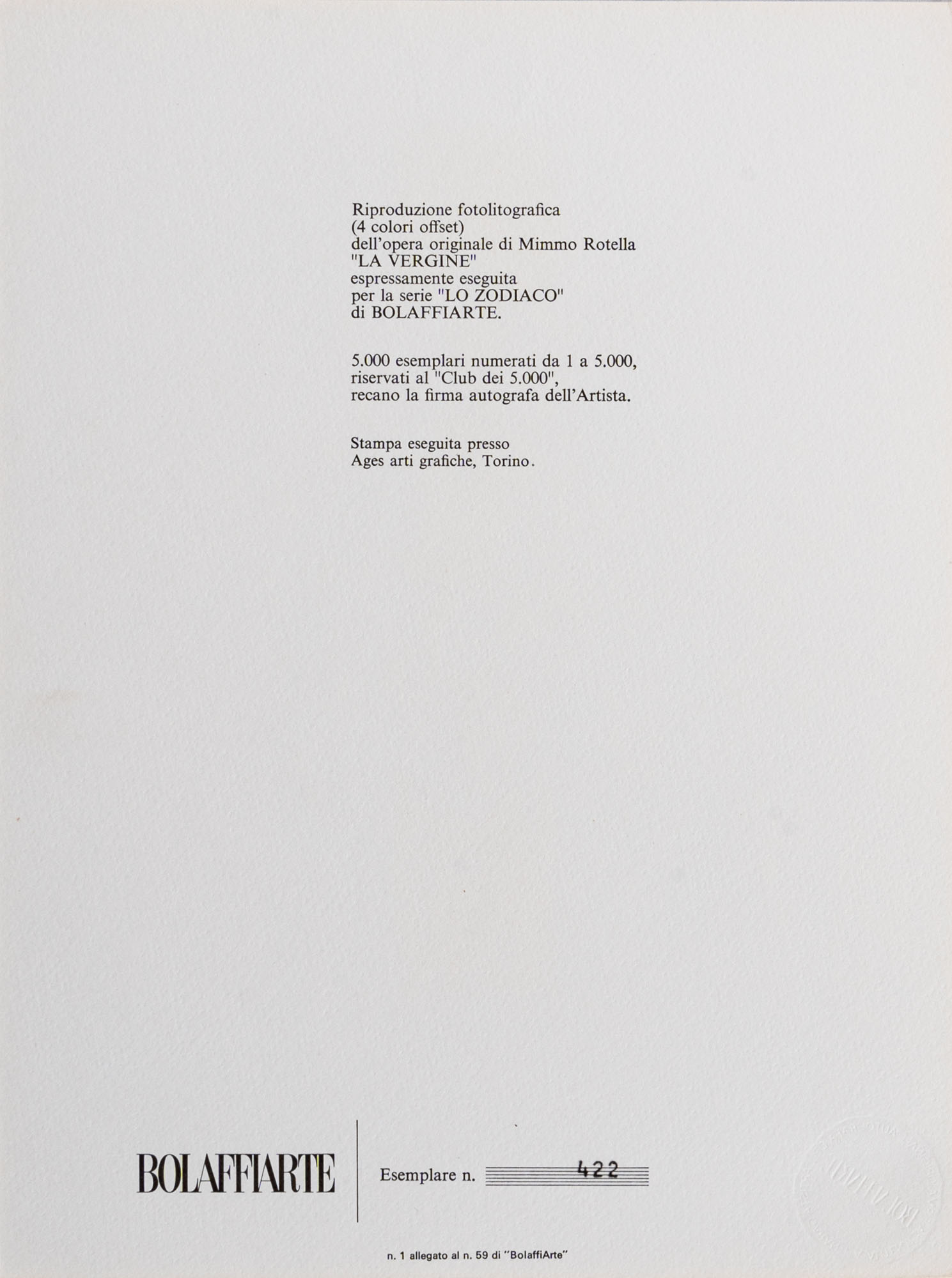 MIMMO ROTELLA(1918 - 2006)La vergine1976Litografia con catalogo, es. 422/500028 x 21 cmFirmata in basso a destraNumerazione al retro