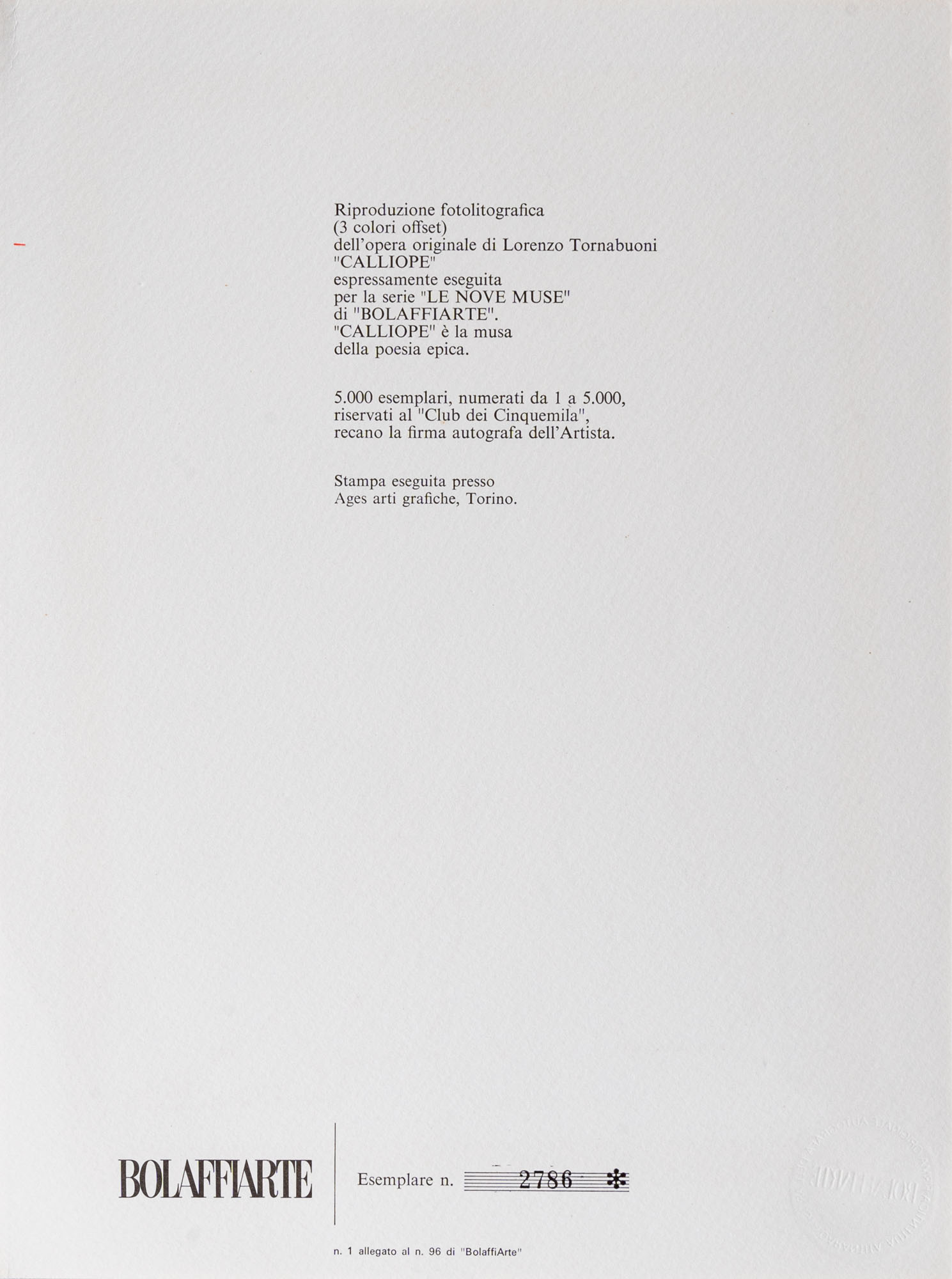 LORENZO TORNABUONI(1934 - 2004)Calliope1980Litografia con catalogo, es. 2786/500028 x 21 cmFirmata in basso a destraNumerazione al retro