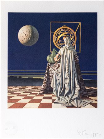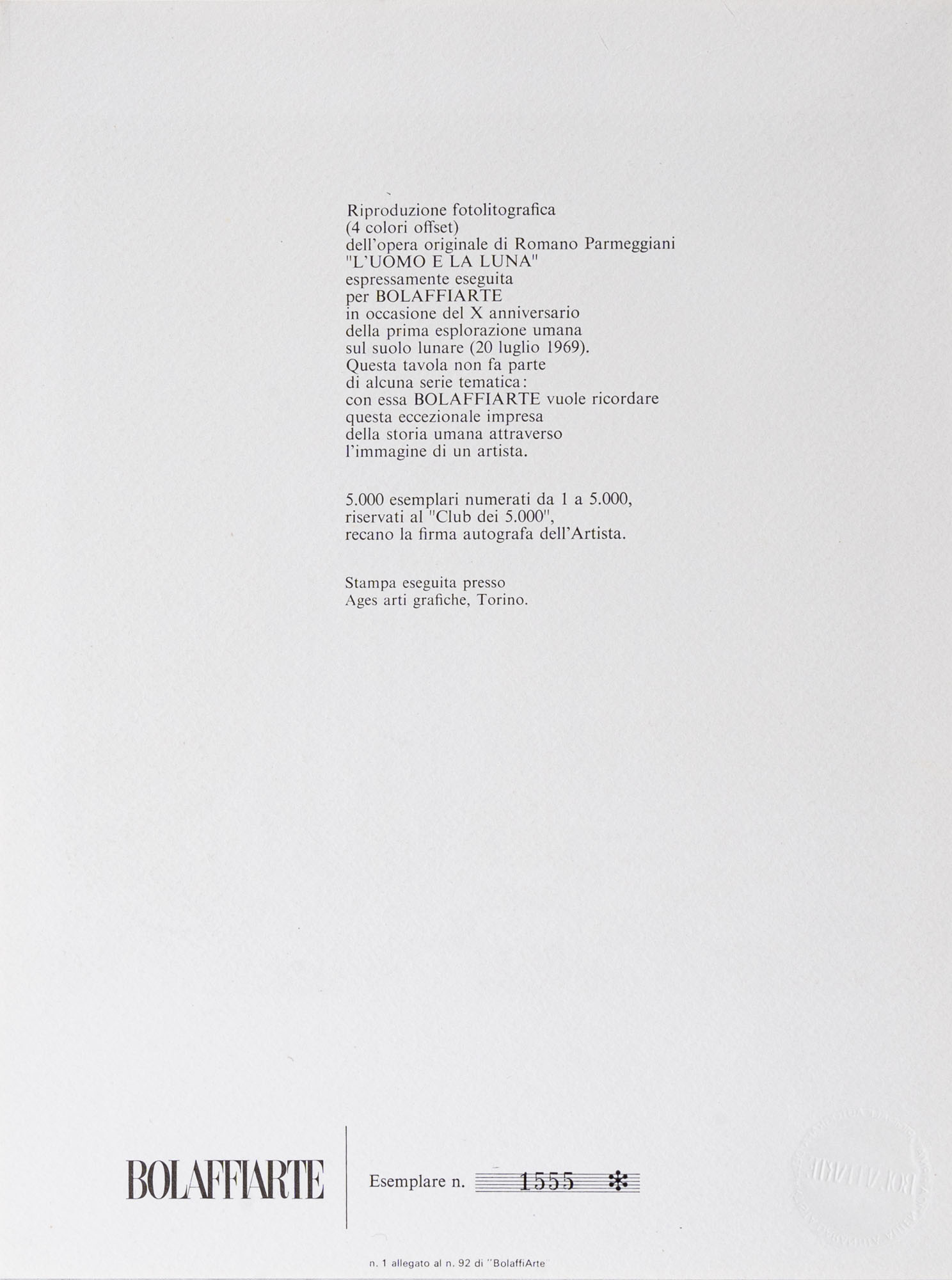 ROMANO PARMEGGIANI(1930 - 2002)L'uomo e la luna1979Litografia con catalogo, es. 1555/500028 x 21 cmFirmata in basso a destraNumerazione al retro