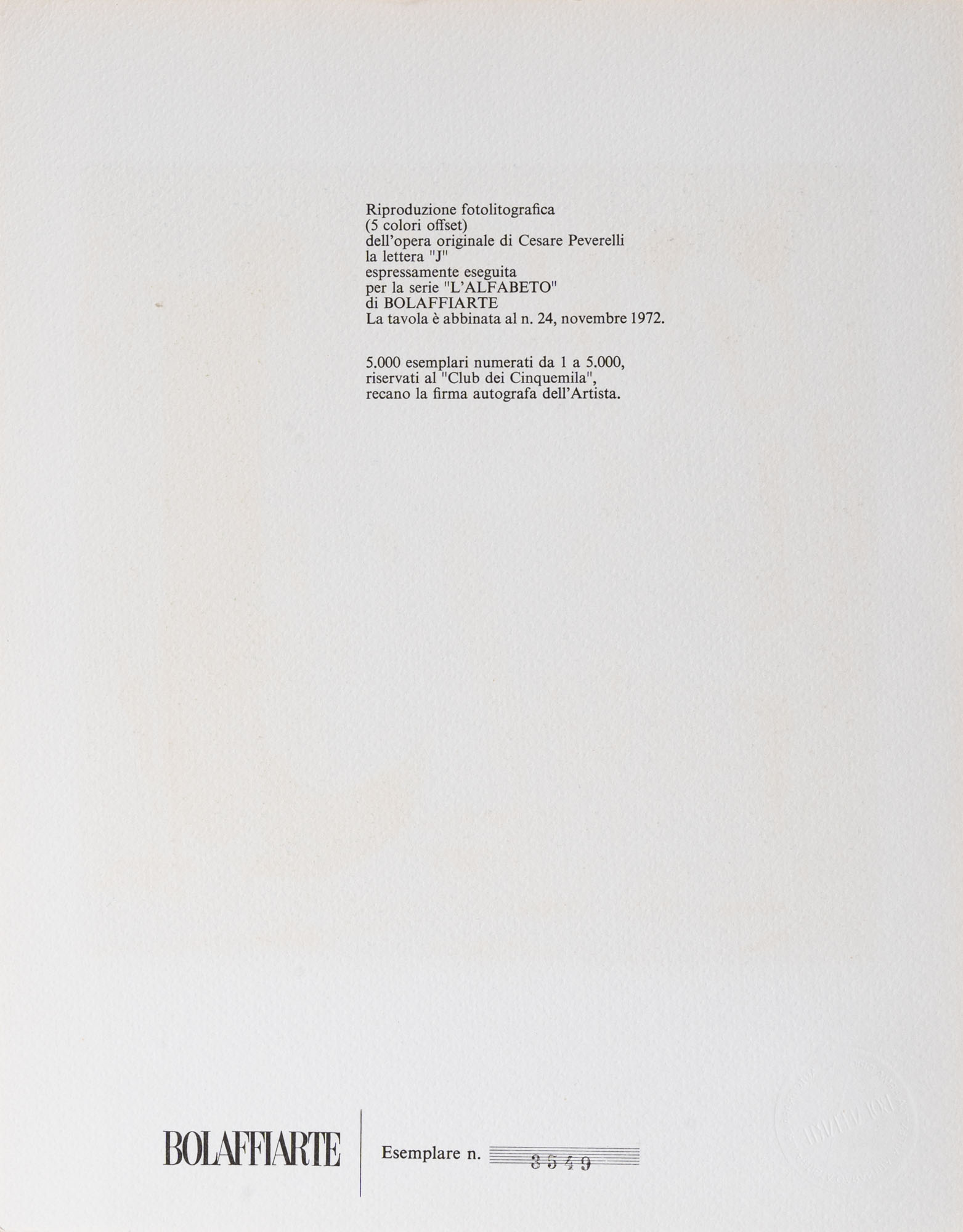 CESARE PEVERELLI(1922 - 2000)Lettera J1972Litografia con catalogo, es. 3549/500030 x 23,5 cmFirmata in basso a destraNumerazione al retro