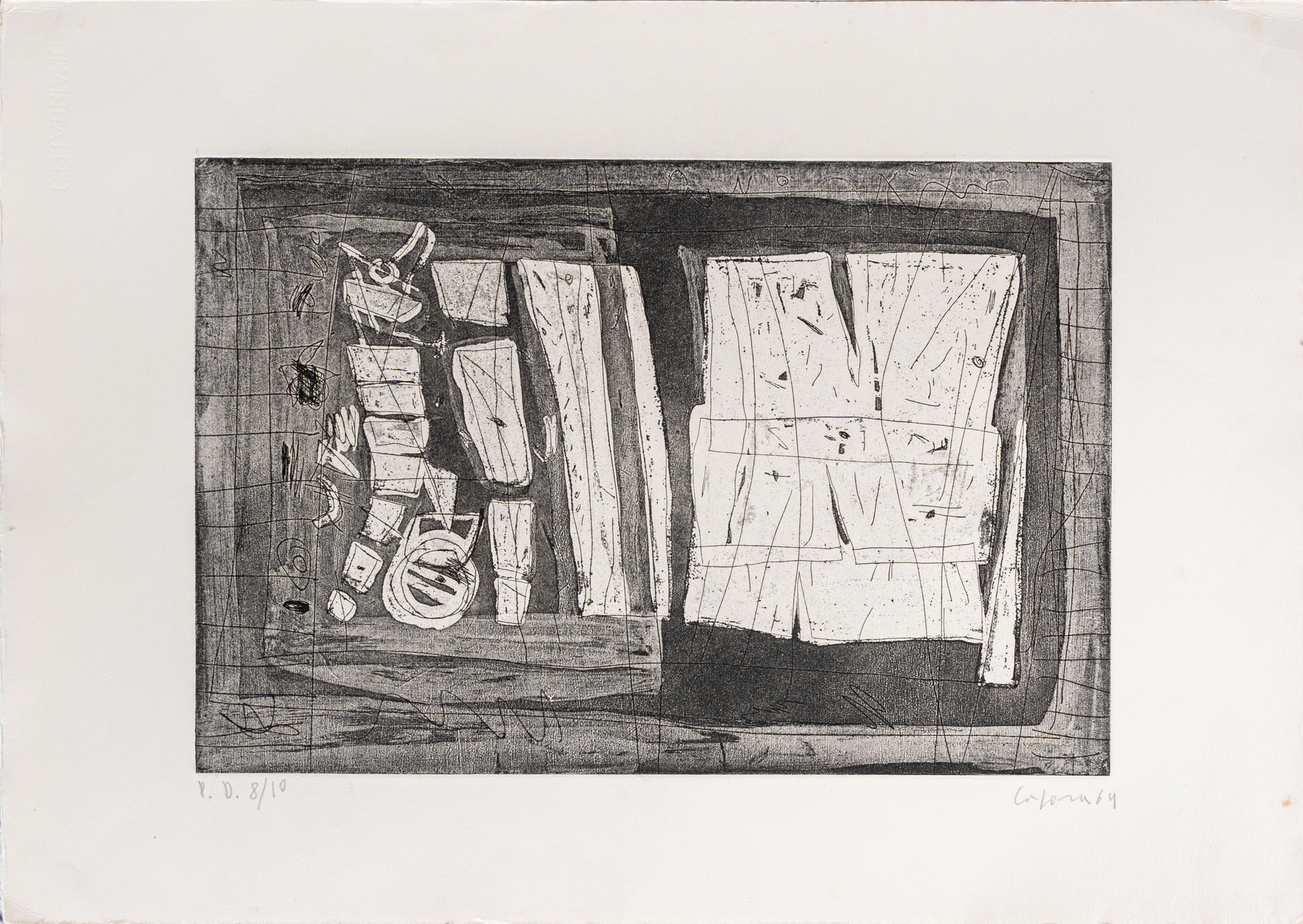 ANTONIO CORPORA(1909 - 2004)Senza titolo1969Acquaforte, es. P.A. 8/1049 x 33 cm (lastra)70 x 49,5 cm (foglio)Firmata e datata a matita in basso destra, numerata a matita in basso a sinistraPROVENIENZA:Collezione privata, Roma