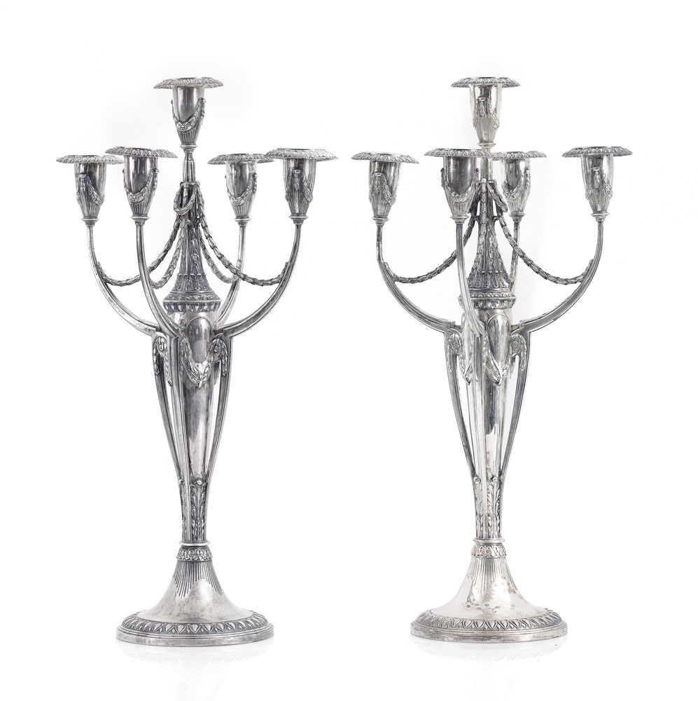 COPPIA DI CANDELABRI IN ARGENTO, GERMANIA, FINE XIX SECOLO, a cinque fiamme con bracci arcuati retti da contrafforti e raccordati da festoni.