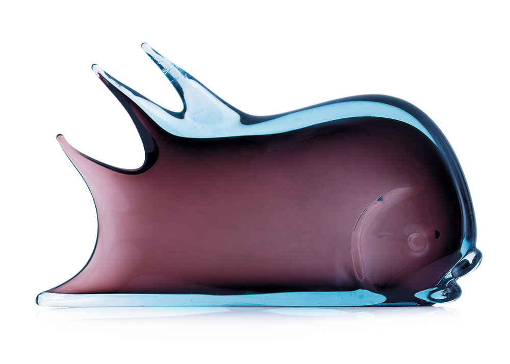 SCULTURA IN VETRO SOMMERSO, SEGUSO, F.POLI, ANNI '50, raffigurante pesce nei toni viola e azzurro.