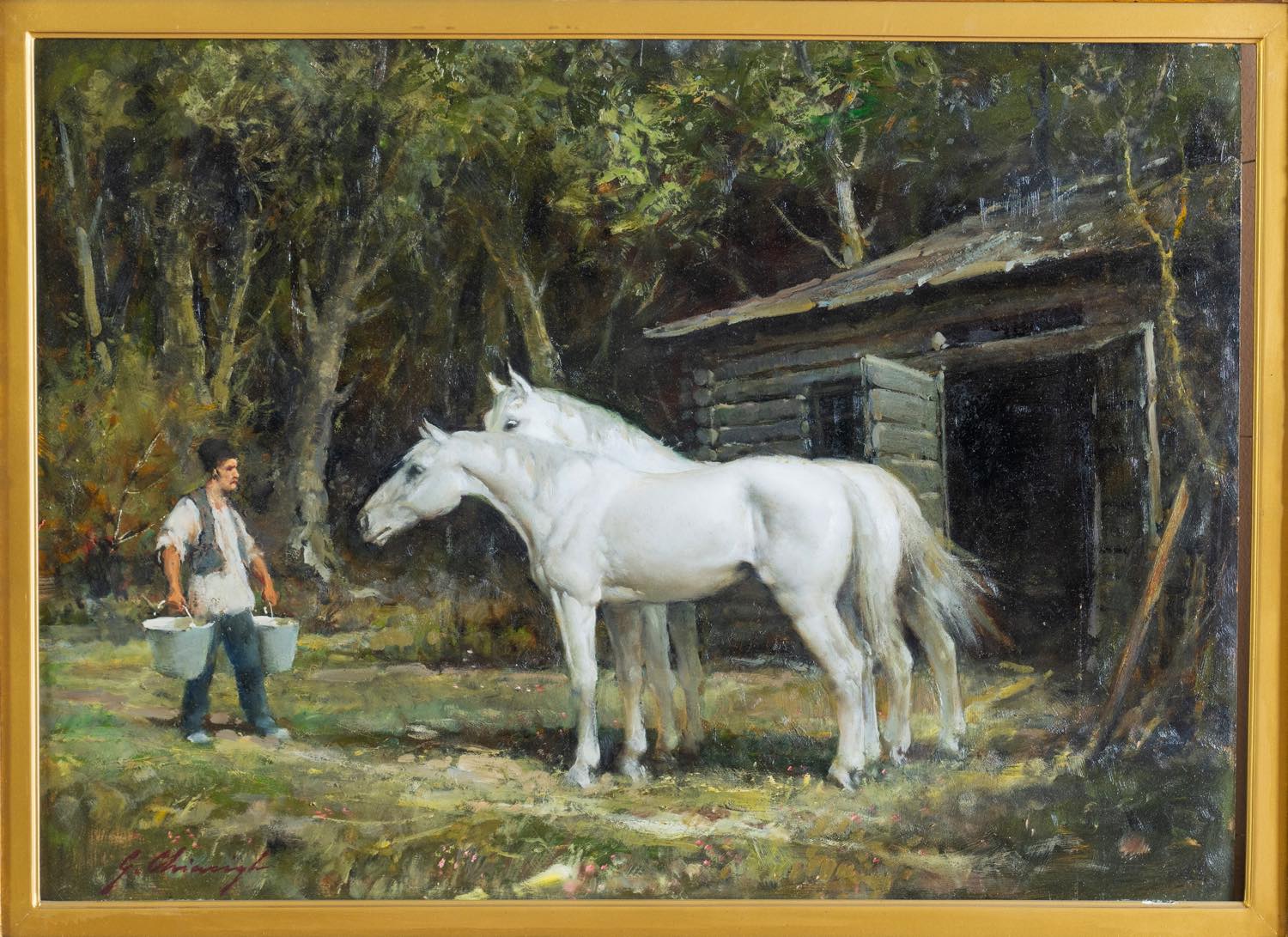 Giuseppe Chiacigh (Vladikavkaz 1895 – Trieste 1967) “Stalliere con cavalli”.