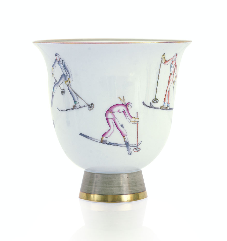 VASO A COPPA IN PORCELLANA, RICHARD GINORI, G.PONTI, 1933, decoro policromo a sciatori e profili in oro; marchio in verde "Richard Ginori 33-11" e in rosso circolare "decorazione eseguita da richard ginori".