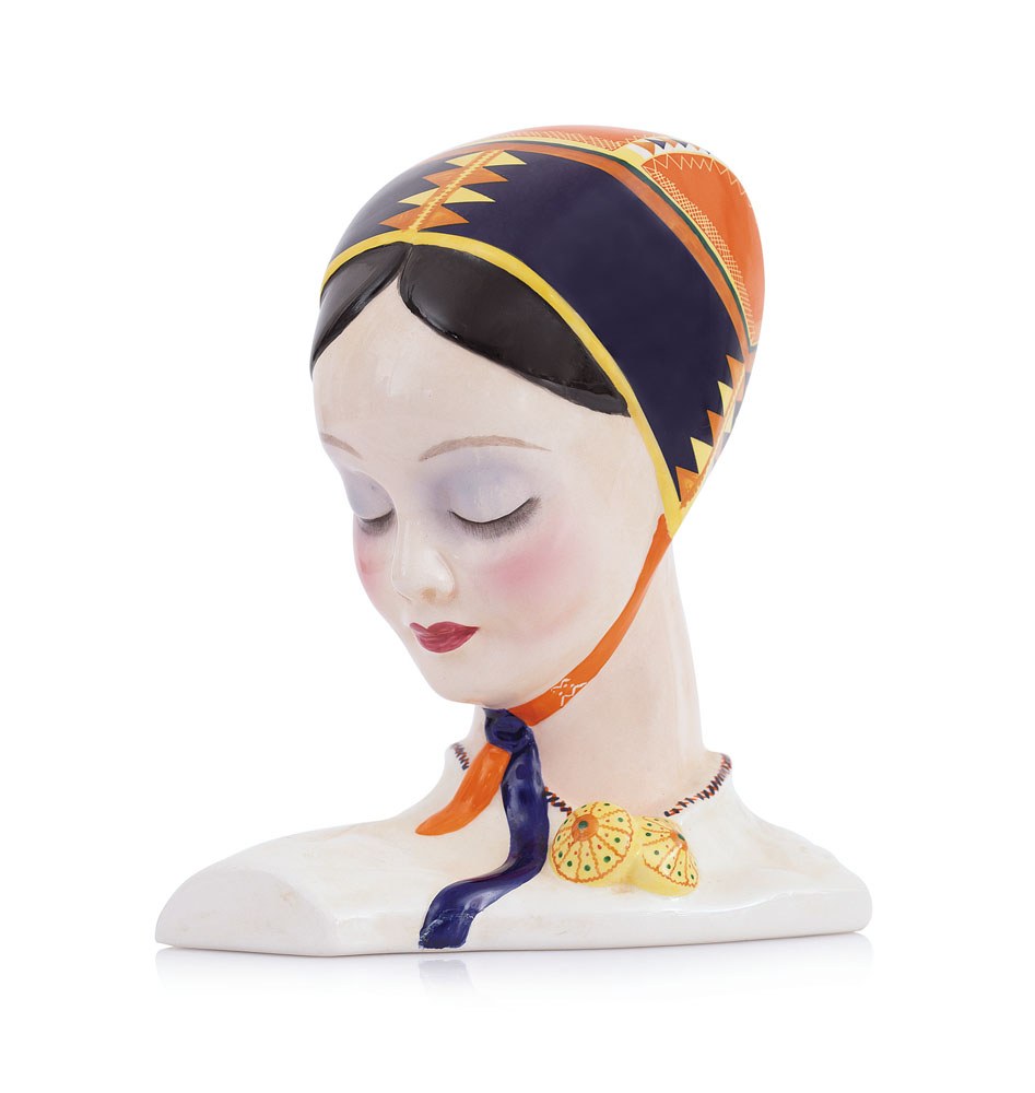 BUSTO DI RAGAZZA IN CERAMICA, ESSEVI, ANNI '30, policromo; firma "ESSEVI CAGLIARI MOD.DI.MOLA L.C." e "N.111" sul fondo.