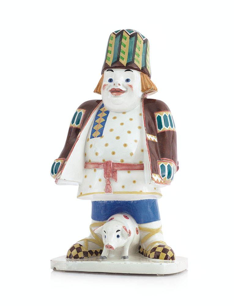RARO GRUPPO IN CERAMICA, LENCI, ANNI '30, PROBABILMENTE S.VACCHETTI E M.STURANI, raffigurante uomo russo su maiale, decoro policromo; qualche sbeccatura minore.