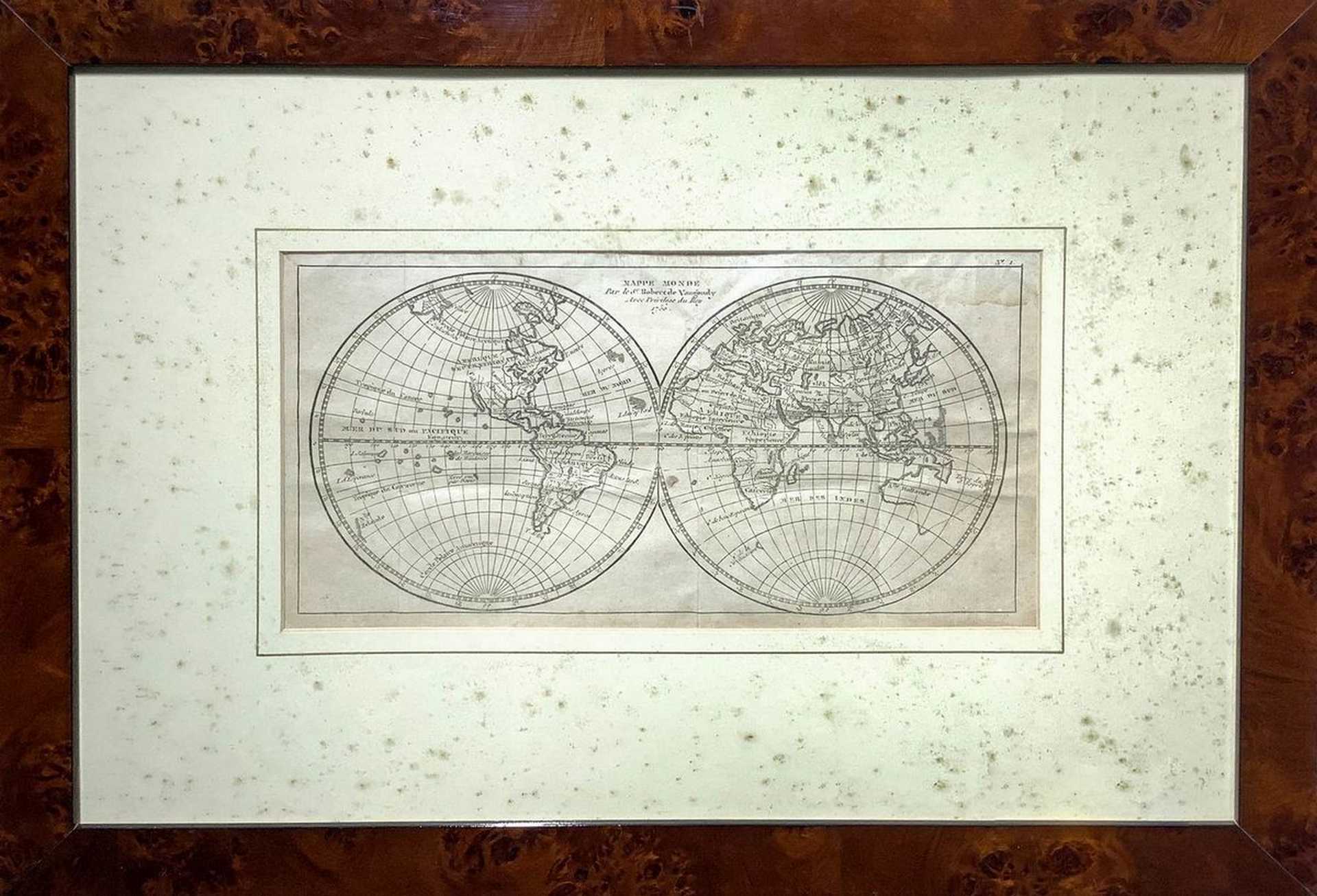 Robert de Vaugond (1688-1766) - Mappe monde, carta geografica, 1755 17x30 cm, in cornice 37x50 incisione in rame Parigi, con cornice in radica; buone condizioni.