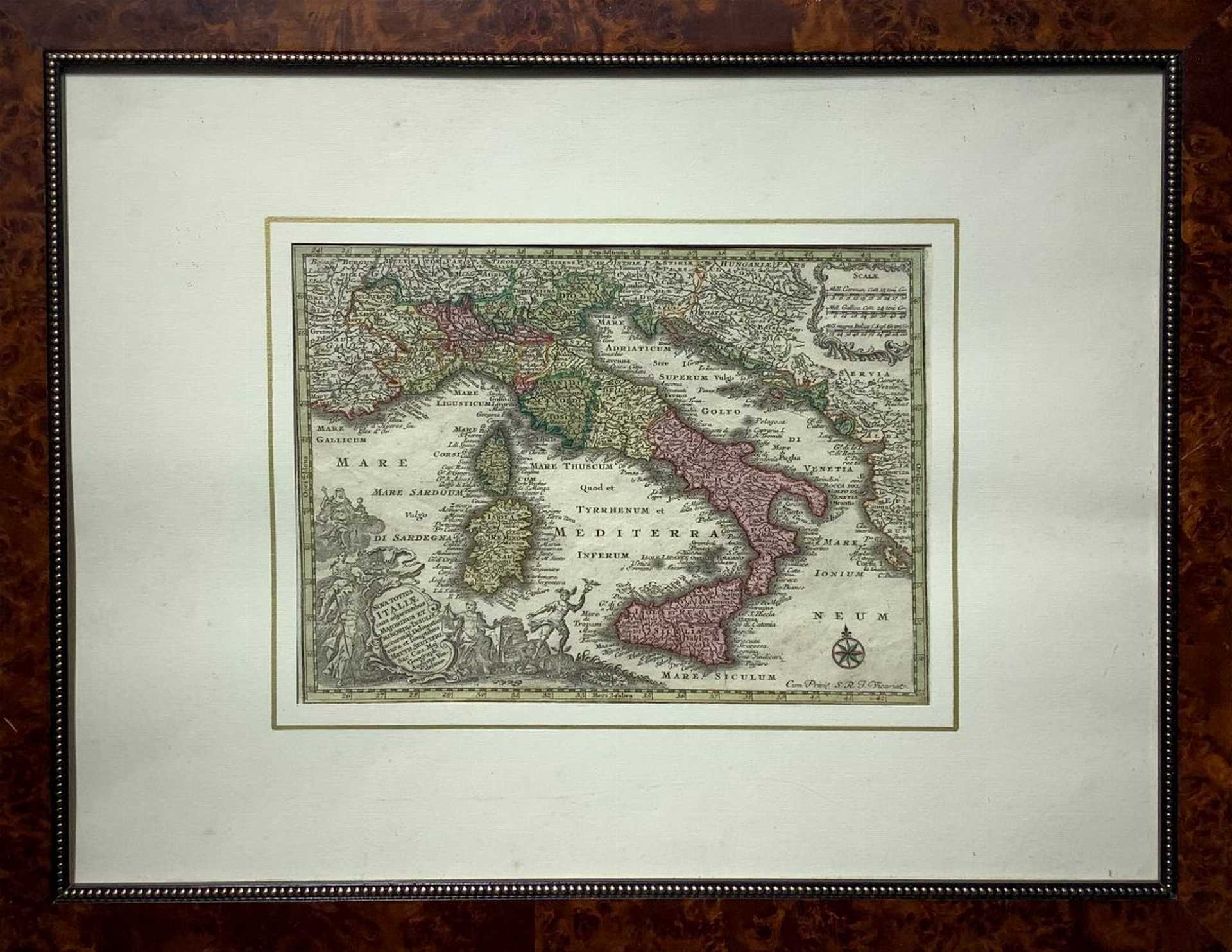 il Vecchio (1678-1756) - Nova totius italiae cum adjacentibus Insulis, carta geografica, 1744 20x25,5 cm Incisione in rame ad acquaforte Tratta da "Atlas Minor e Praecipua orbis terrarum" di Lotter Tobias, stampata a Avgsburg-Col. Cornice in radica. Riduzione della carta d’Italia che nonostante le dimensioni è molto particolareggiata. Arrichita da un grande cartiglio con il titolo. Ottime condizioni.