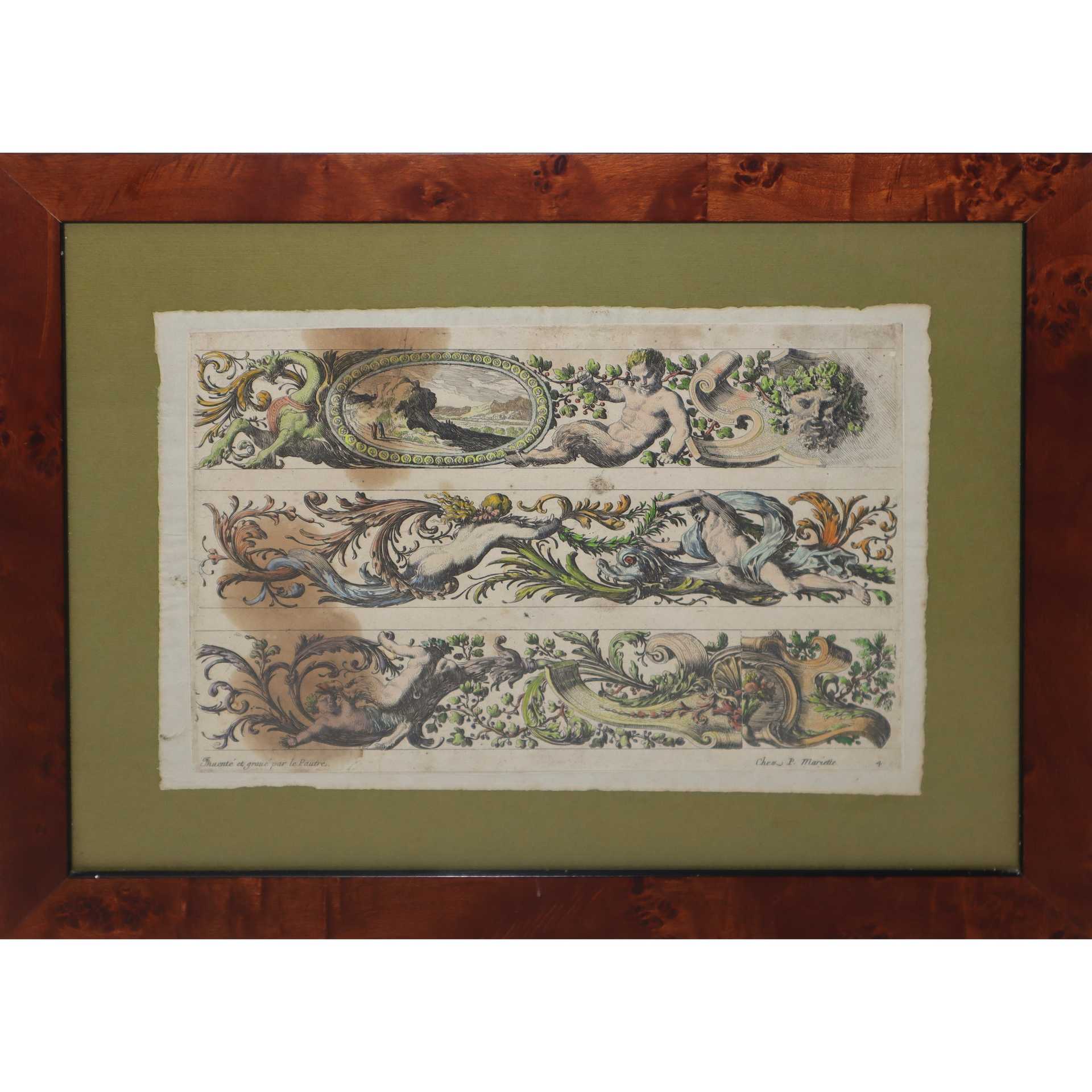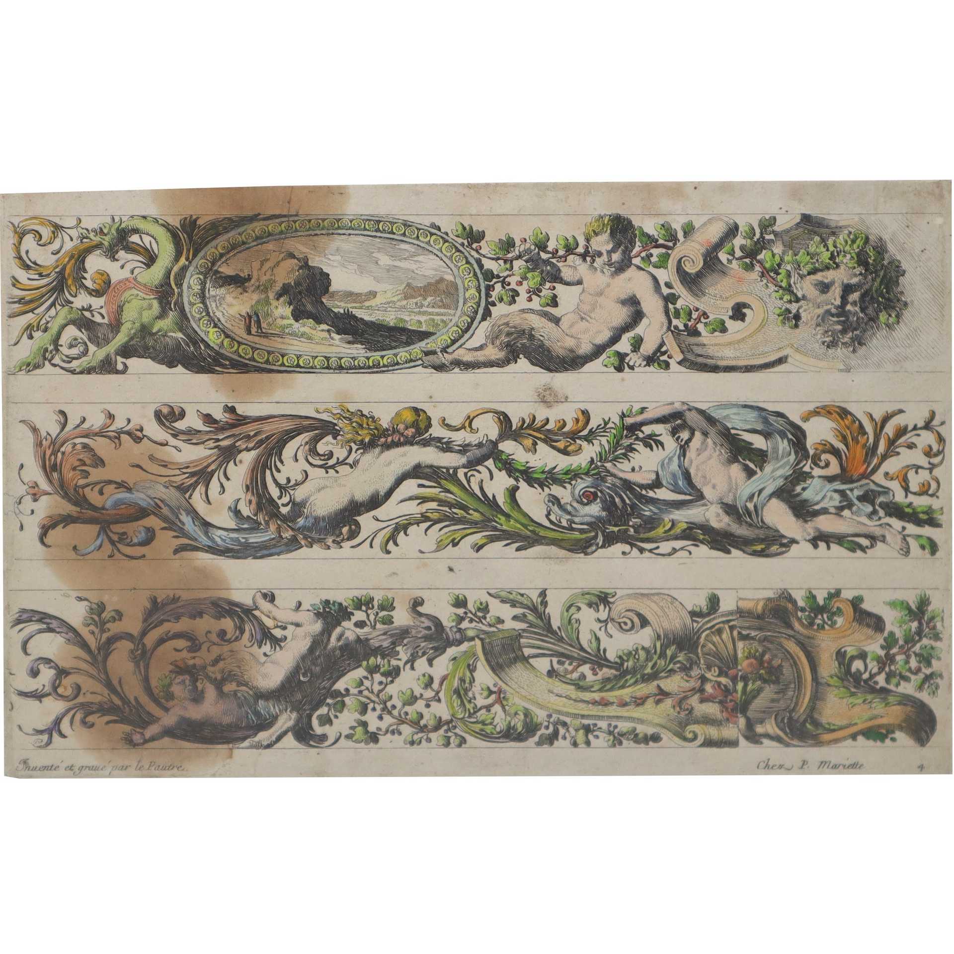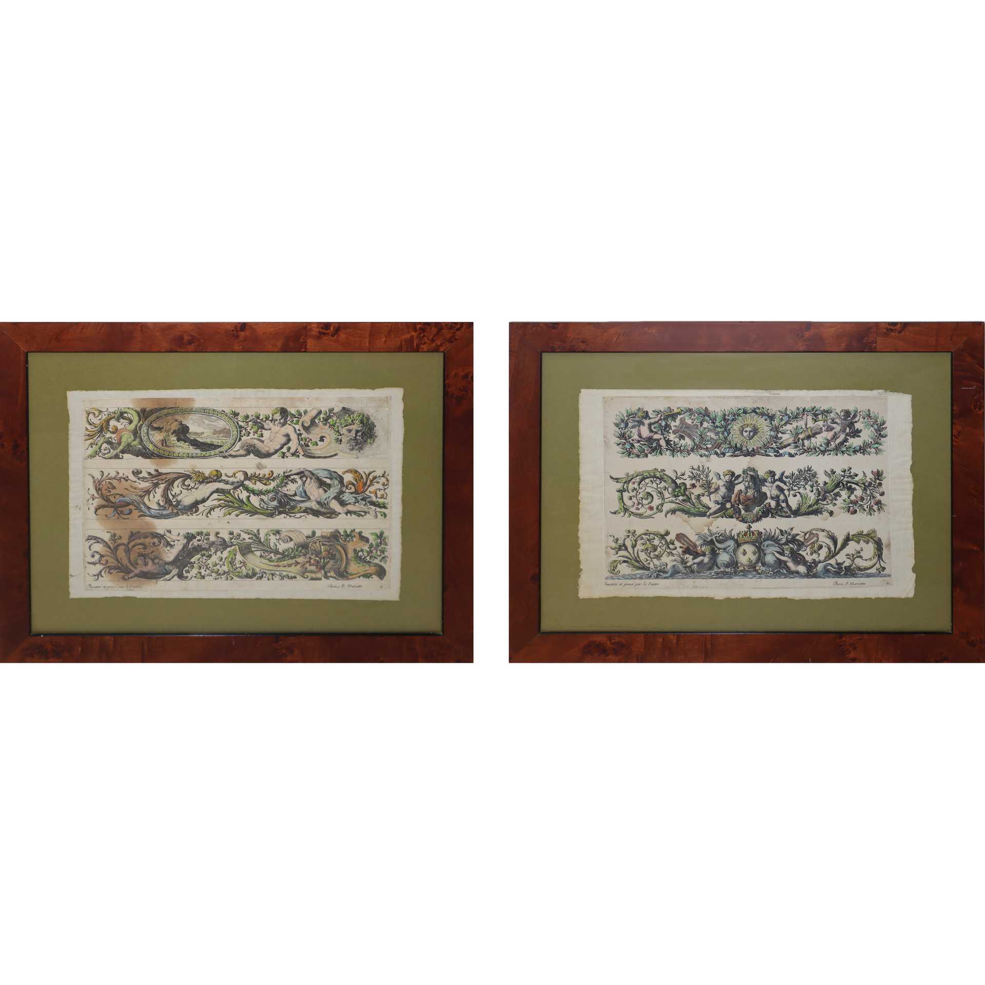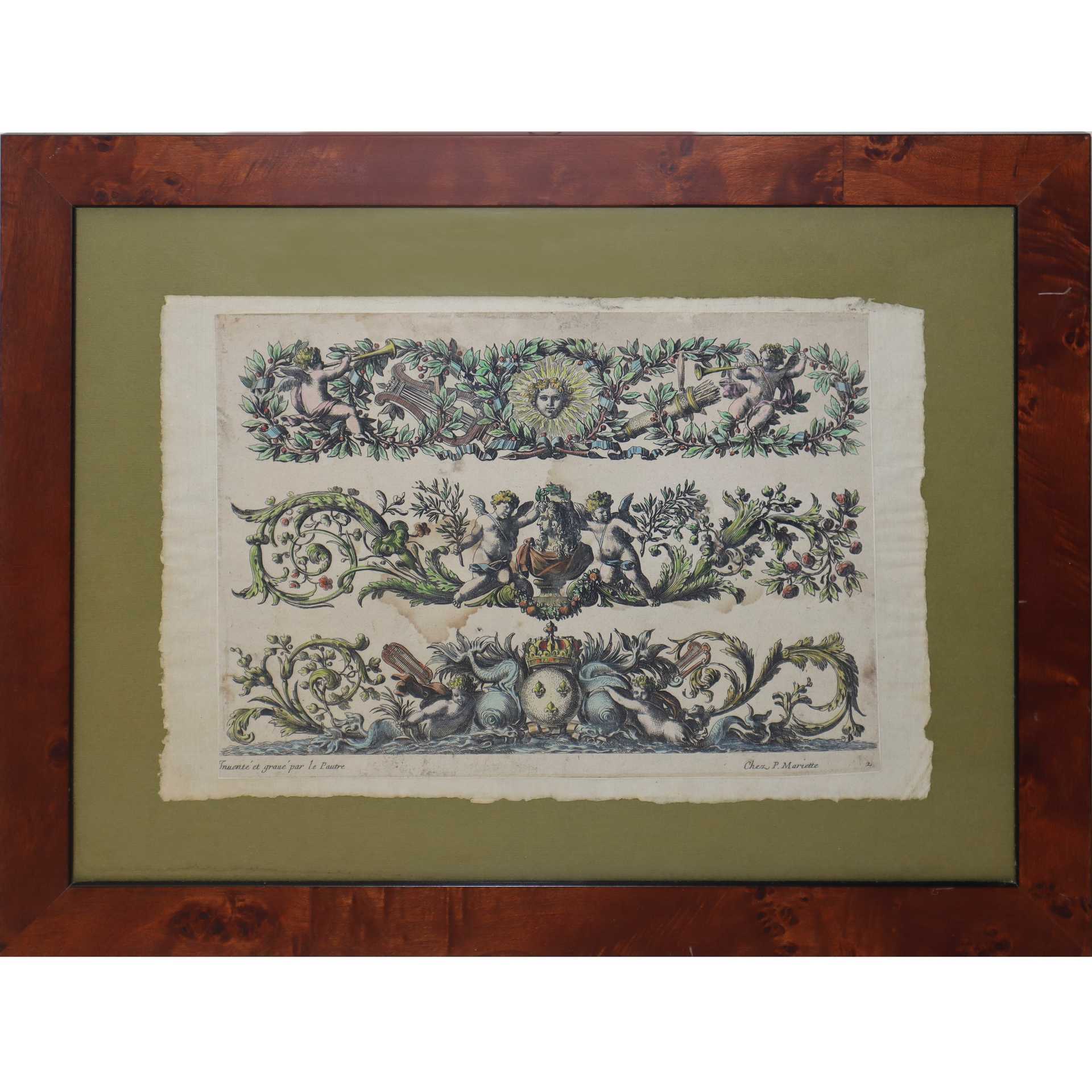 Jean Le Pautre (Parigi 1618-Parigi 1682) - Coppia di incisioni raffiguranti festoni con Putti, Fiori, Delfini H mm 209 x 308 - 209 x 306 / in cornice cm 34 x 44 Incisione all'acquaforte acquerellata Editore Chez P. Mariette