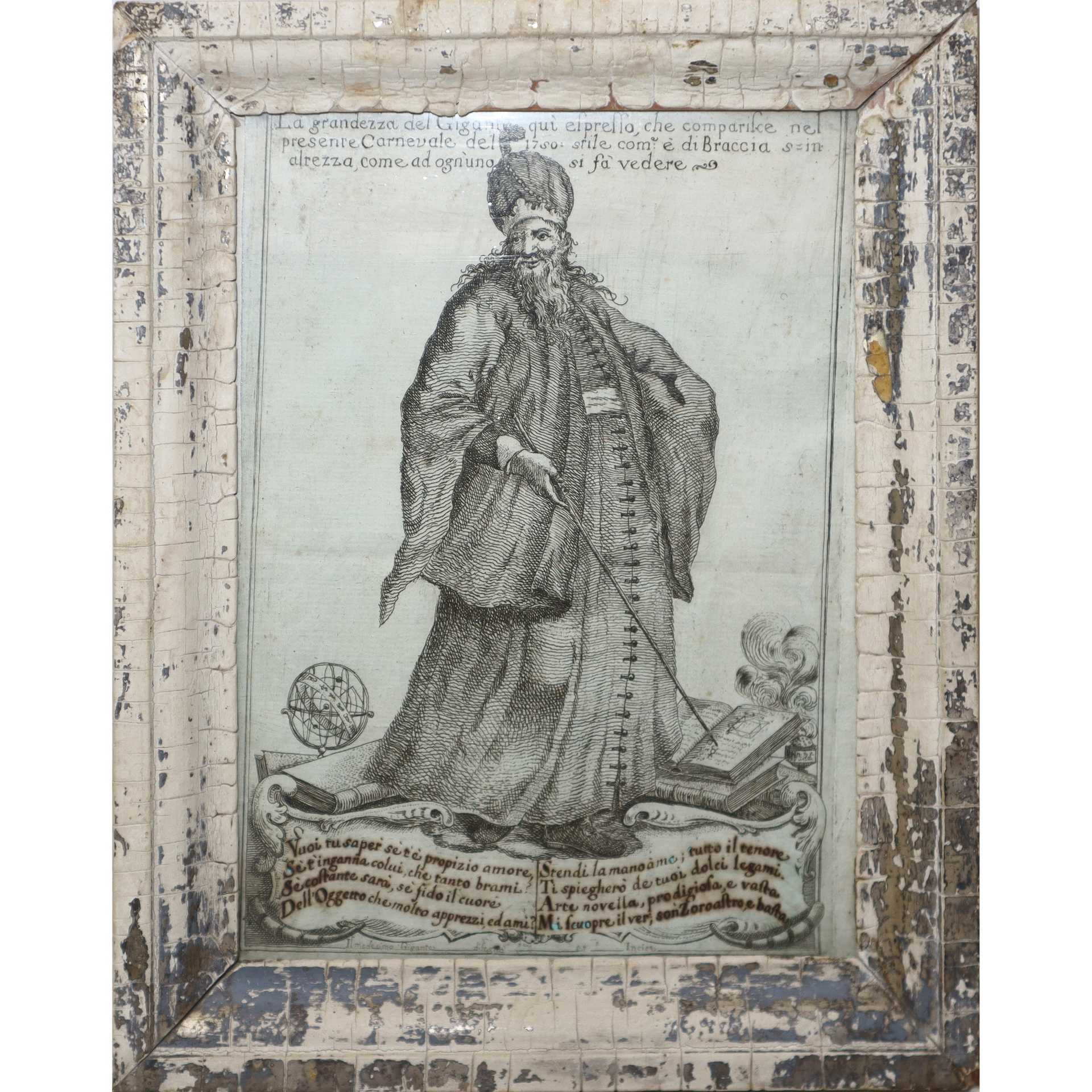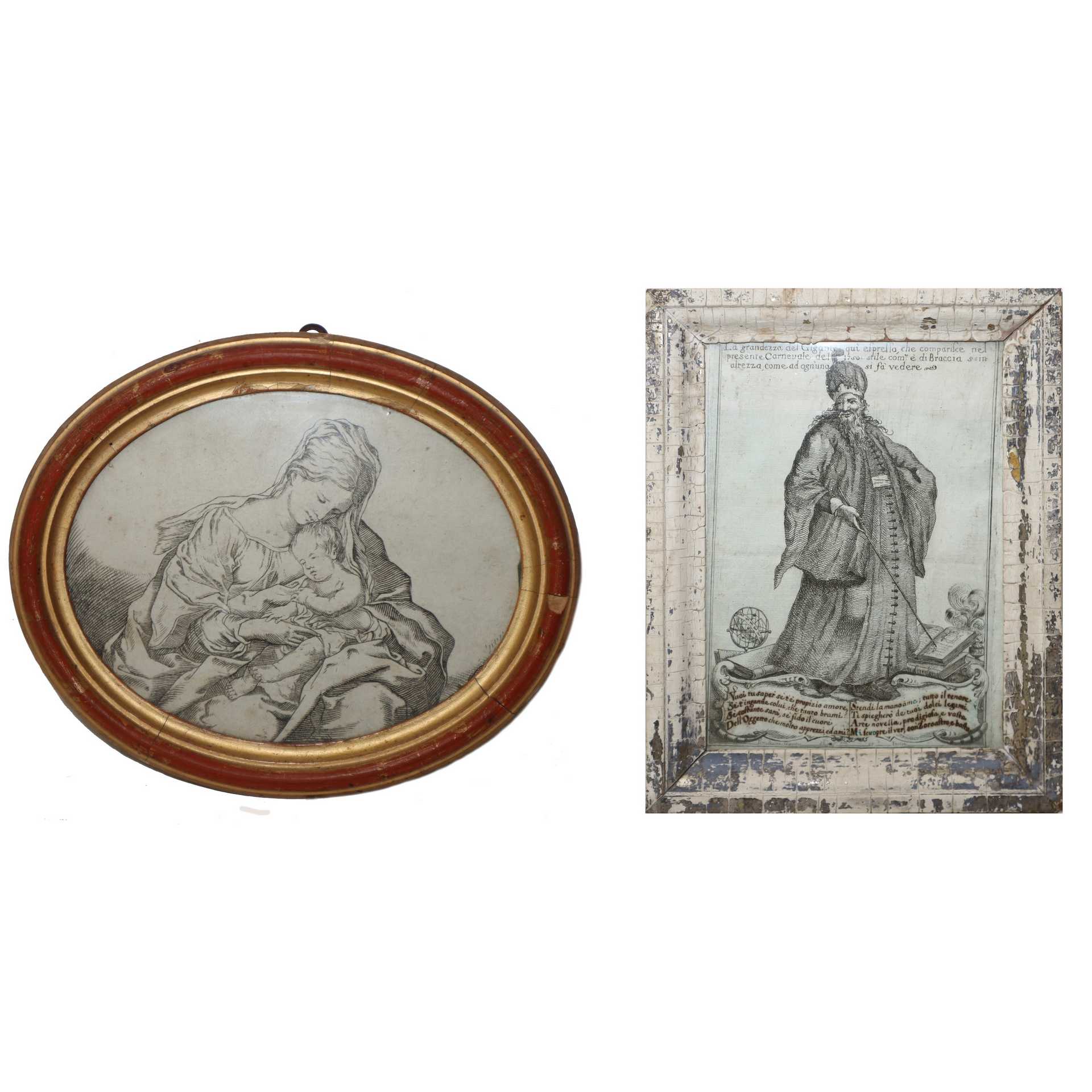N°2 incisioni, La grandezza del gigante comparso nel carnevale del 1750 e ovale Madonna con bambino, 18th secolo Gigante MM 220 x 157 in cornice cm 26 x 20, Madonna MM 120 x 150 in cornice dorata e laccata cm 15 x 18 Incisione all'acquaforte su carta vergata