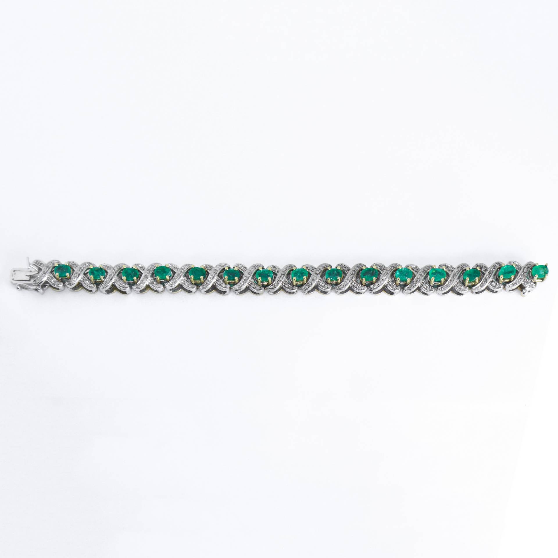Bracciale tennis in oro bianco e oro giallo con diamanti e smeraldi gr. 32,2 (oro+pietre) cm 19 smeraldi 7,5 carati ca. smeraldi 7,5 carati ca.