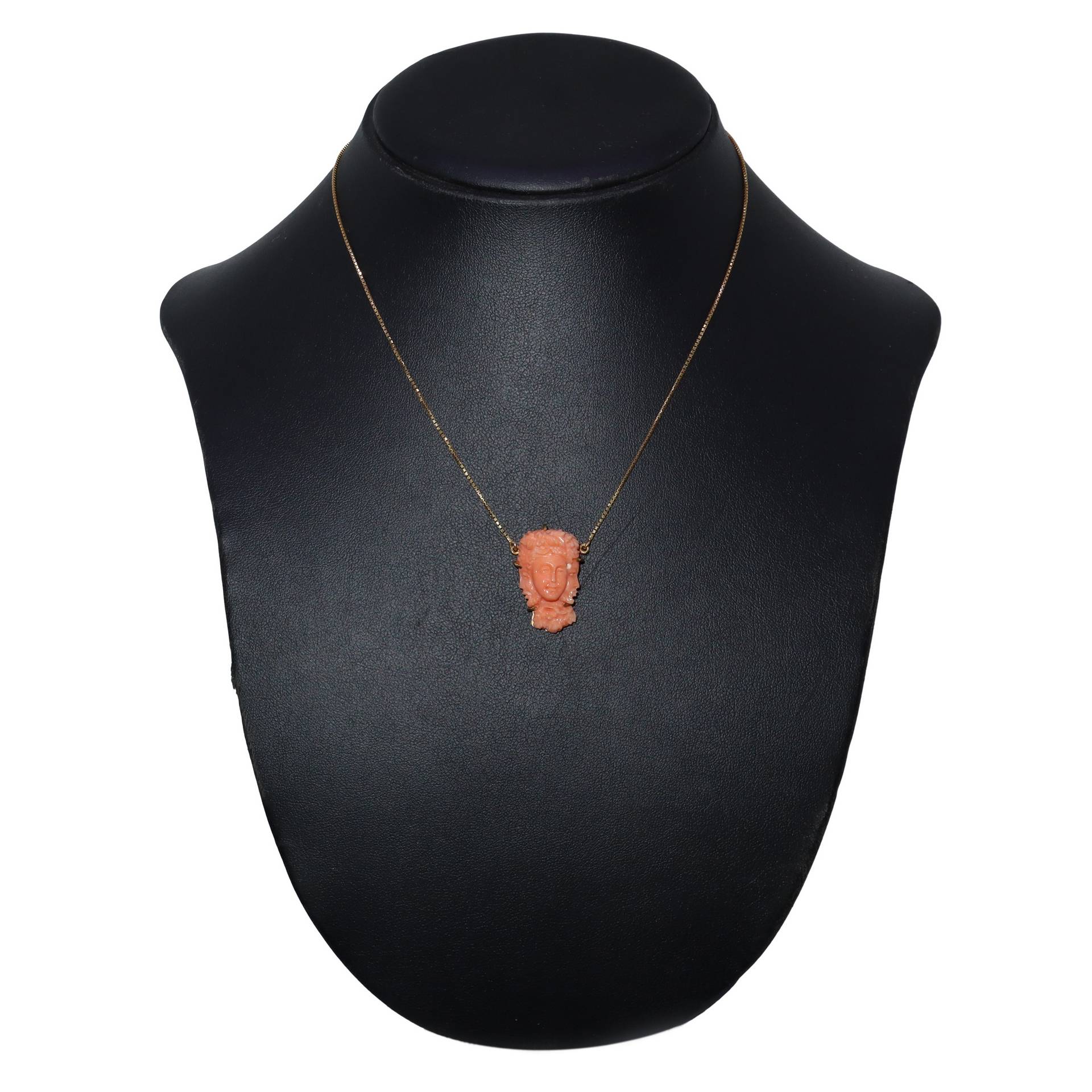 Pendentif testa con tre volti in corallo rosa con catena in oro giallo 750 pendentif cm 2,5 con catena cm 23 gr. 8,1 (ciondolo+catena) Punzone 750 sulla chiusura Punzone 750 sulla chiusura
