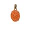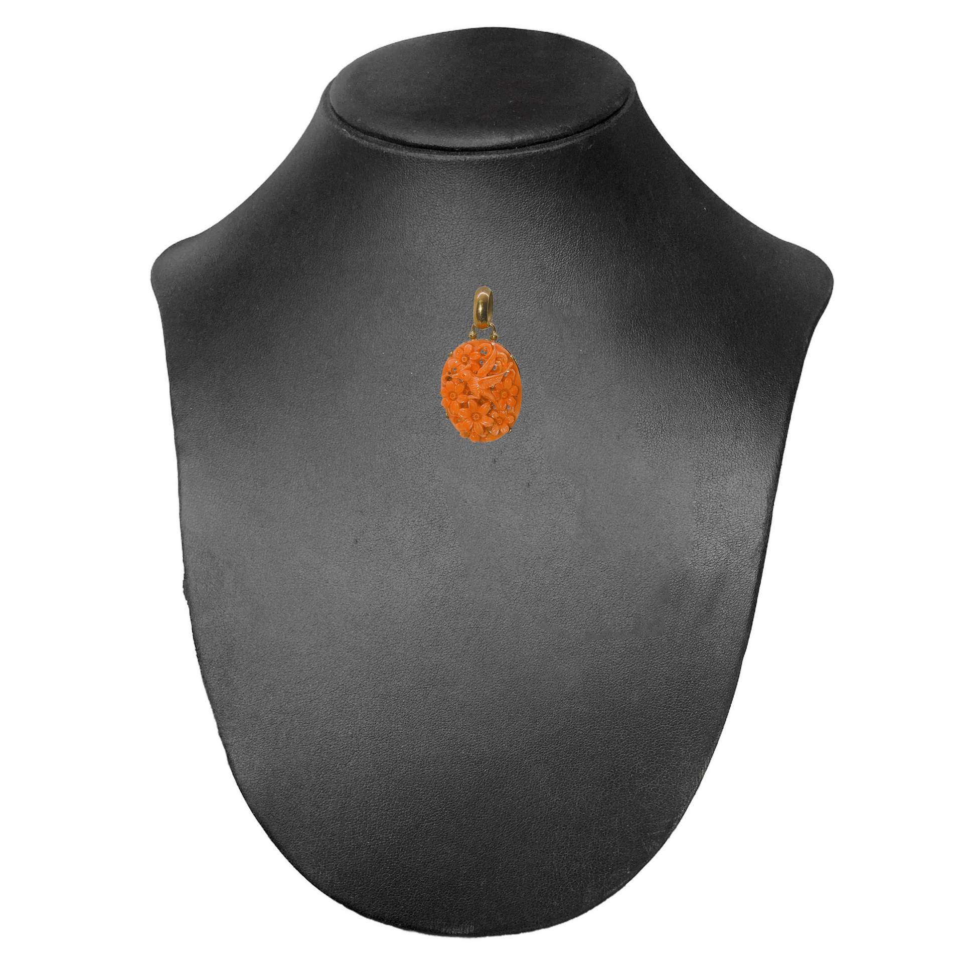Ciondolo in oro a basso titolo e corallo rosa intarsiato con motivi floreali e uccello