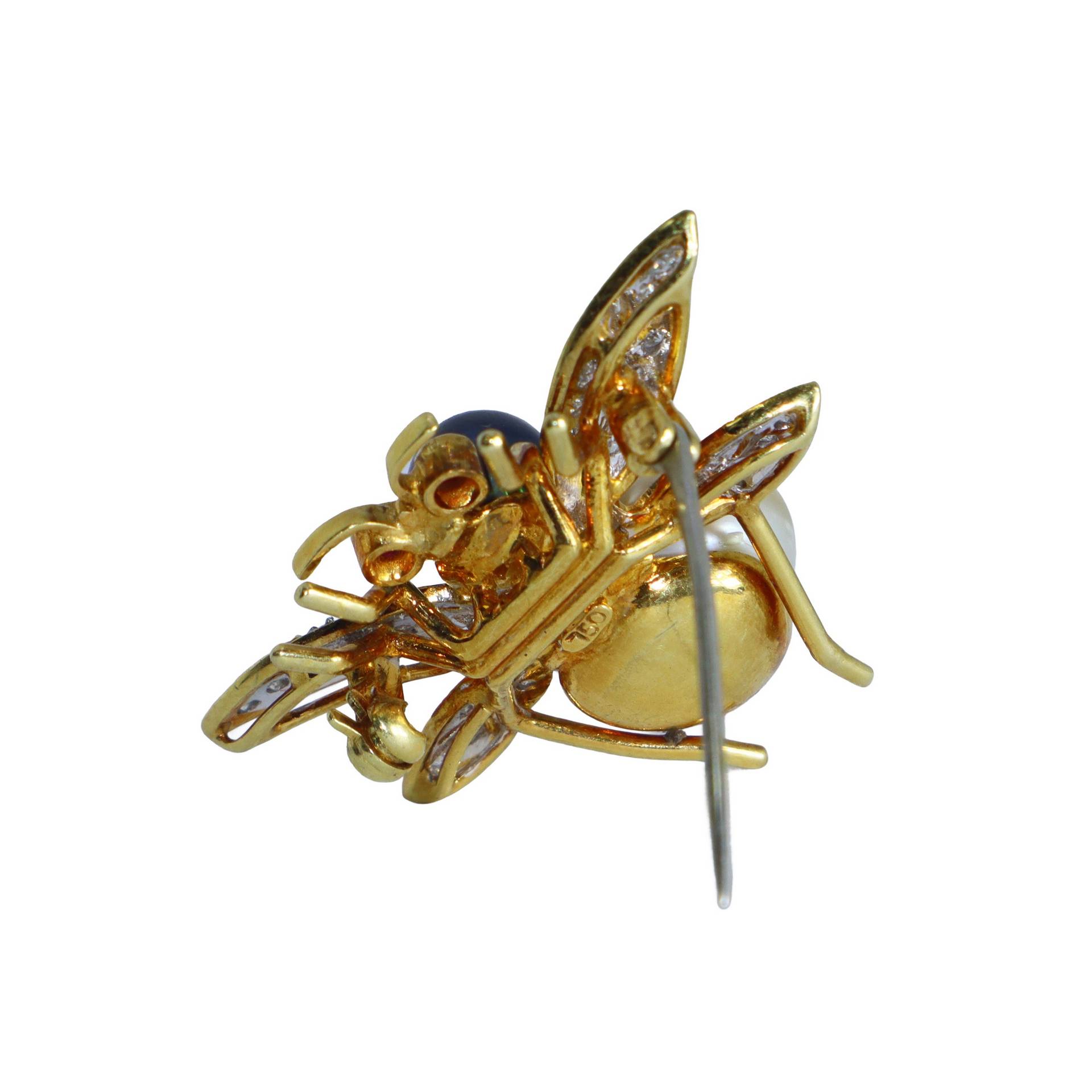 Spilla in oro 750, perle, diamanti e granati a forma di insetto