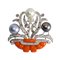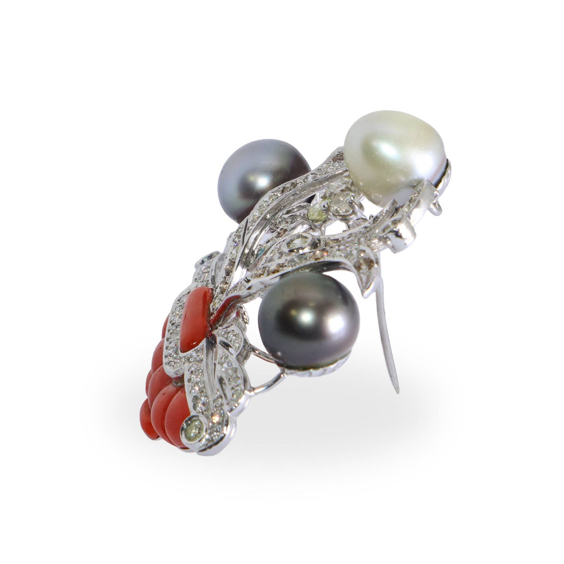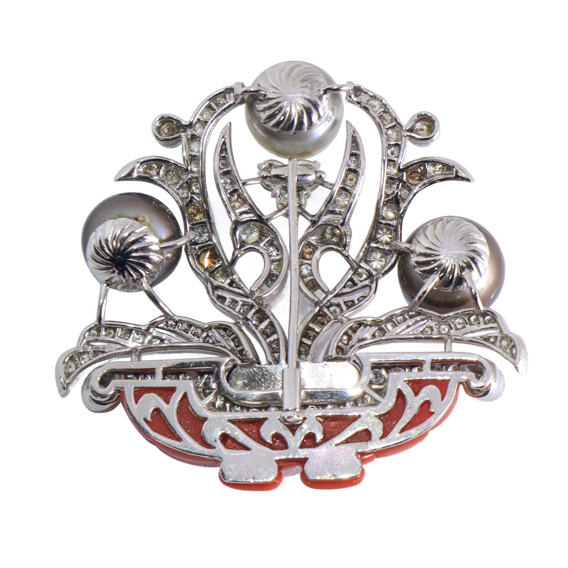 Spilla in oro bianco con diamanti corallo e perle gr. 35,5 (oro+pietre) cm 6 Punzone sul retro. Punzone sul retro.