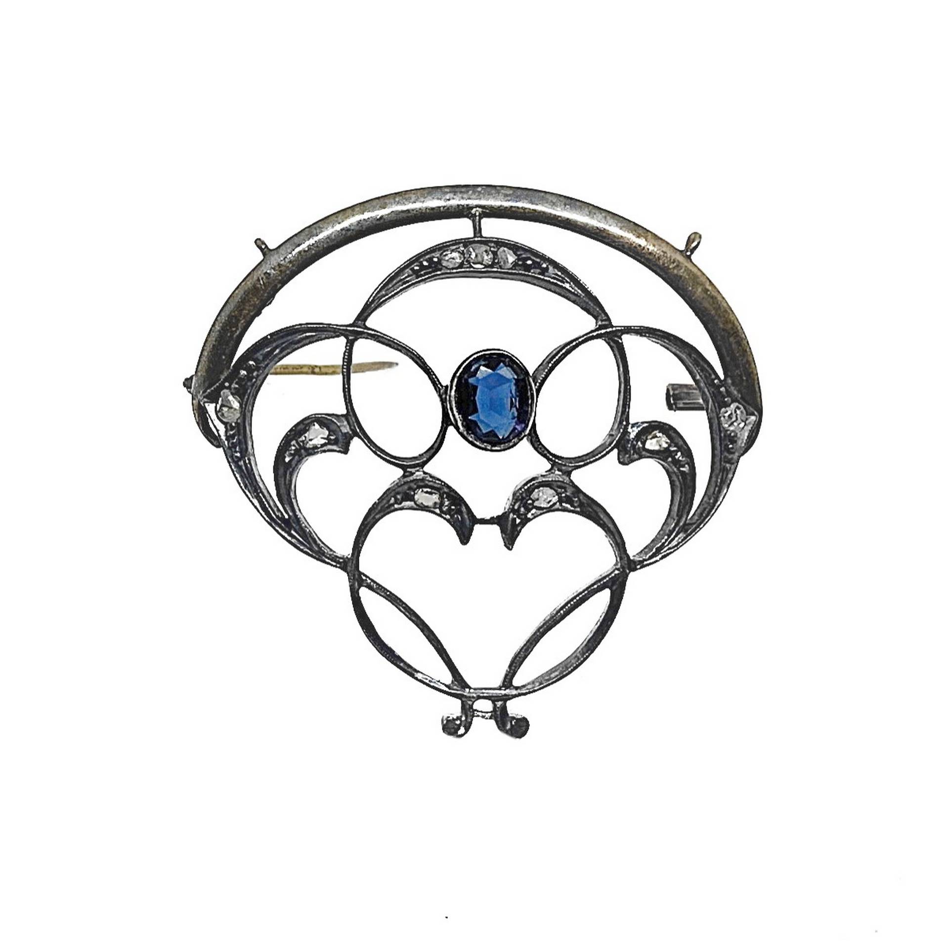 Spilla in Argento , 20th century Gr. 8,2 Lavorazione in argento con zaffiro centrale e rose coronè.Lavorazione in argento con zaffiro centrale e rose coronè.