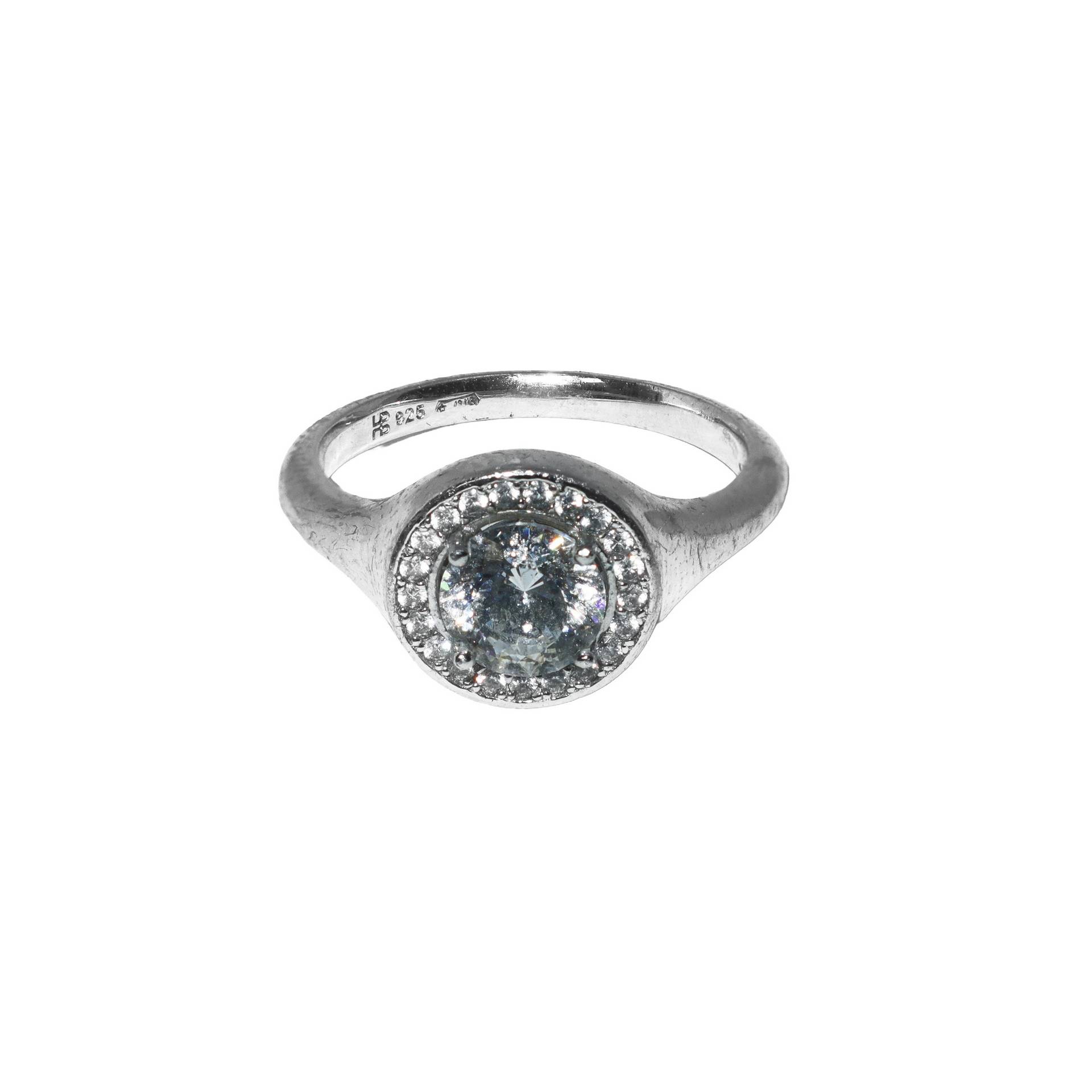 Anello in argento con pietra sintetica centrale circolare circondato da in cerchio di zirconi