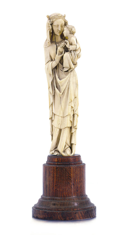 MADONNA CON BAMBINO IN AVORIO, XIX SECOLO, in stile Gotico su base in legno a colonna; alcune crepe.