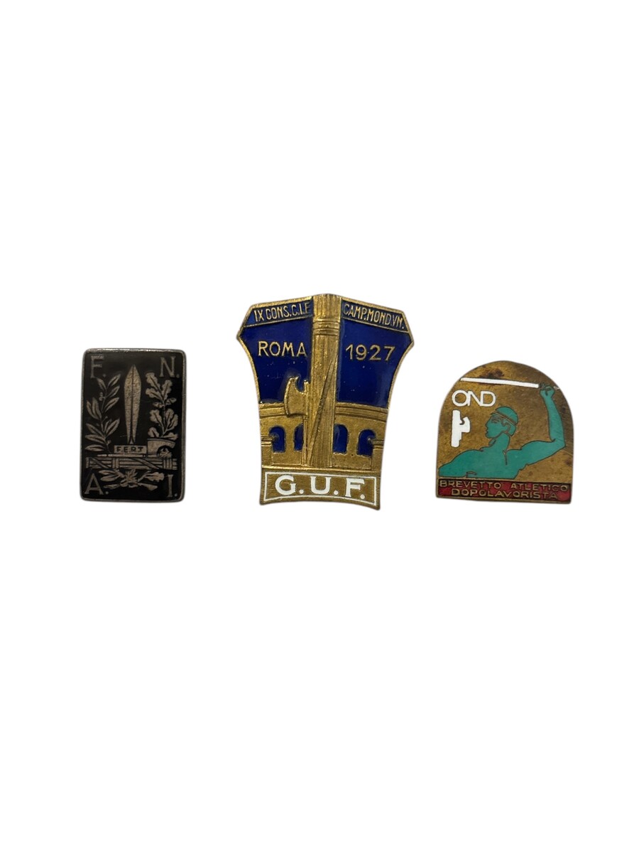Distintivo Opera Nazionale Dopolavoro in metallo smaltato; Distintivo G.U.F in metallo smaltato; Distintivo Federazione Nazionale Arditi d'Italia in metallo smaltato.