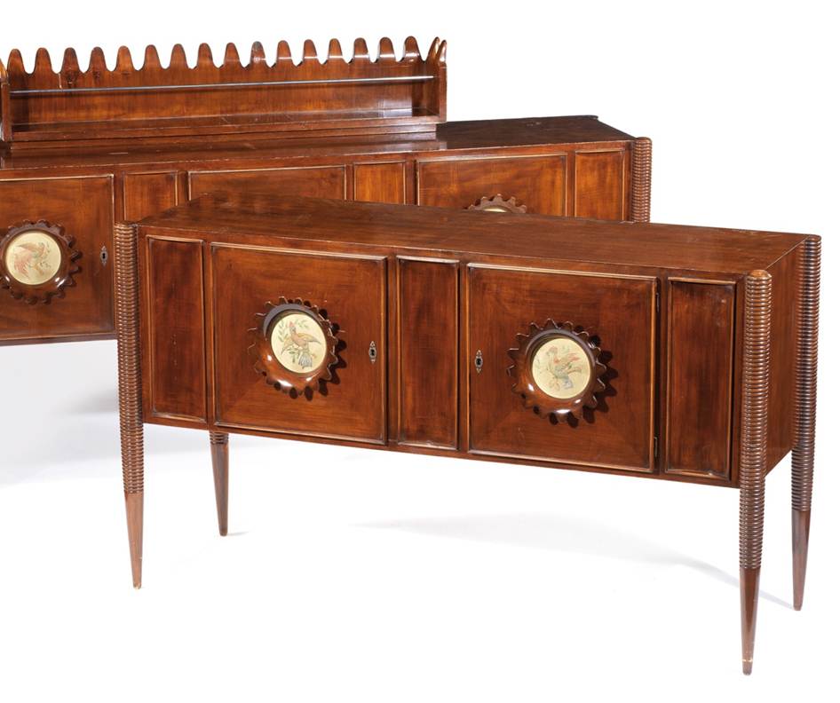 Credenza con specchio Produzione: Colli, 1950 Credenza in noce a ripiani e cassetti con ante recanti formelle dipinte credenza: cm 96 h x 232 x 55; specchio: cm 133 h x 71 x 4 (2)