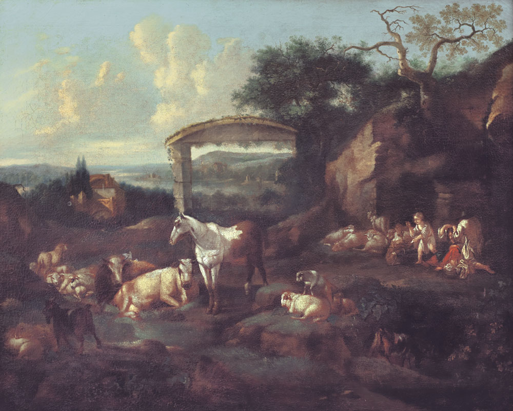 PITTORE DEL XVII SECOLO Paesaggio con pastori e armentiOlio su tela, cm...