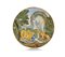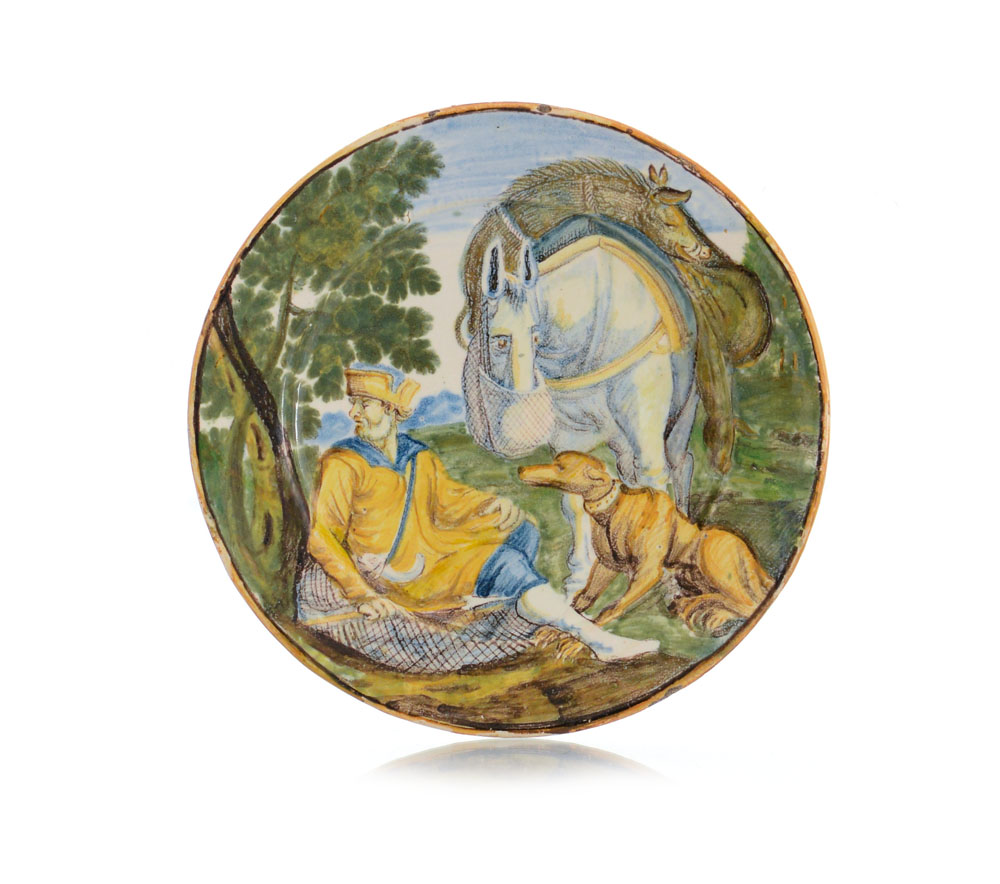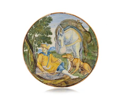 PIATTELLO IN MAIOLICA, CASTELLI, BOTTEGA DEI GRUE, INIZIO XVIII SECOLO, decori policromi con cacciatore, cane e cavallo con cinghiale in groppa a riposo entro paesaggio; restauro.