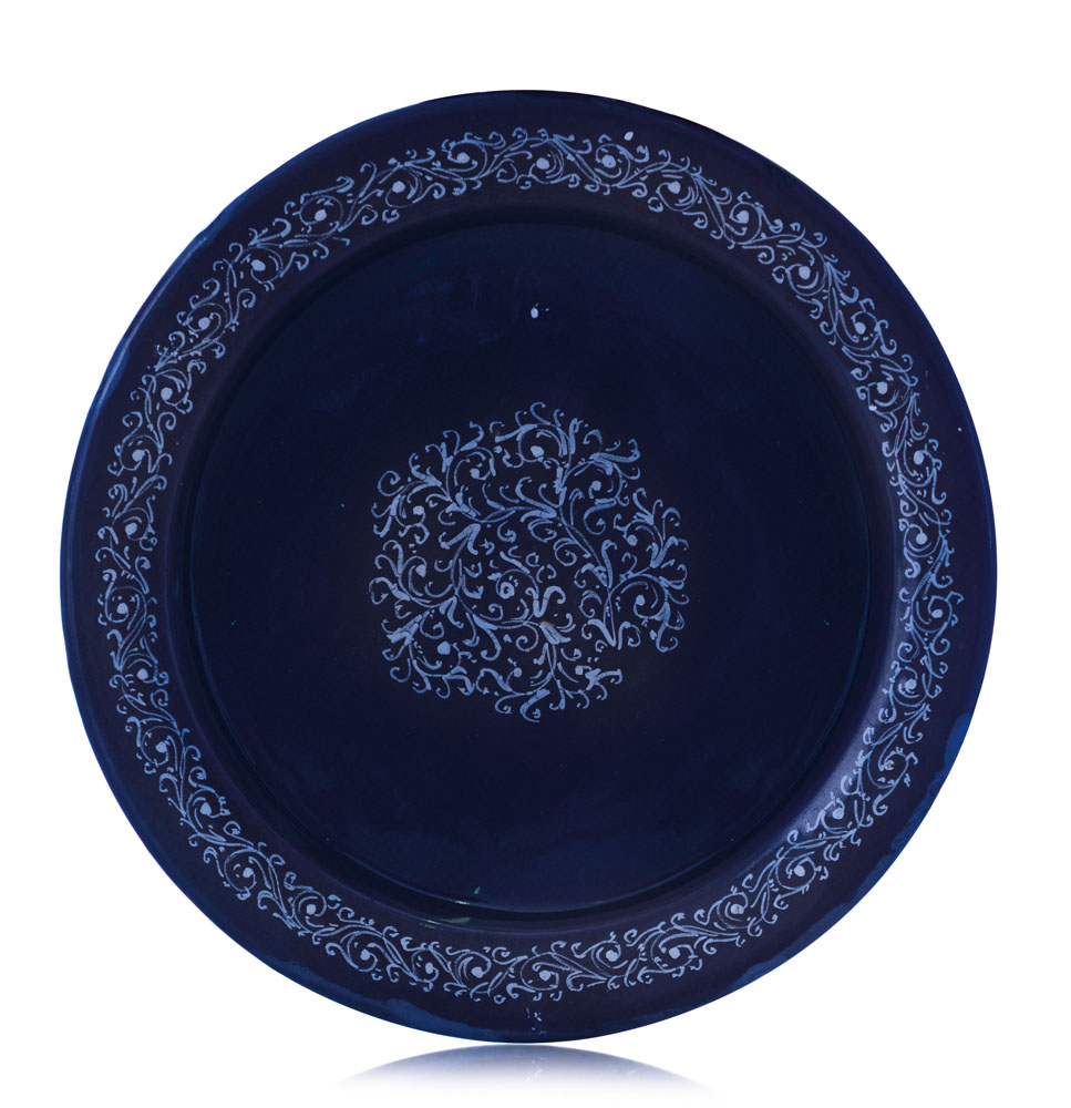 GRANDE PIATTO IN MAIOLICA, CASTELLI, FINE XVI SECOLO, PROBABILMENTE BOTTEGA DEI POMPEI, decoro fitomorfo azzurro su fondo blu cobalto.
