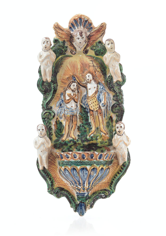 ACQUASANTIERA IN MAIOLICA, XVII SECOLO, decoro a rilievo con battesimo di Cristo e putti, vasca baccellata; restauro alla sommità e sbeccature.